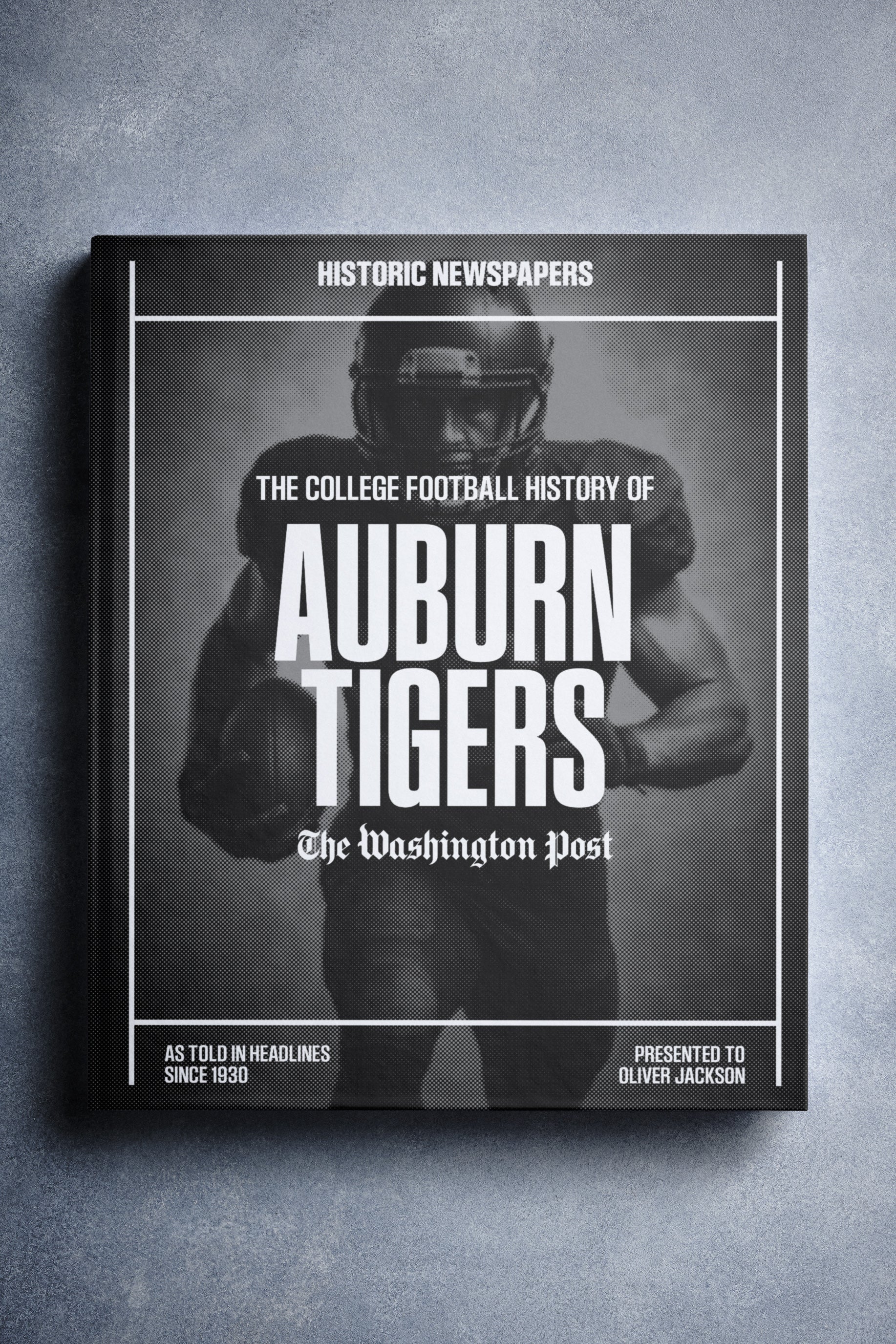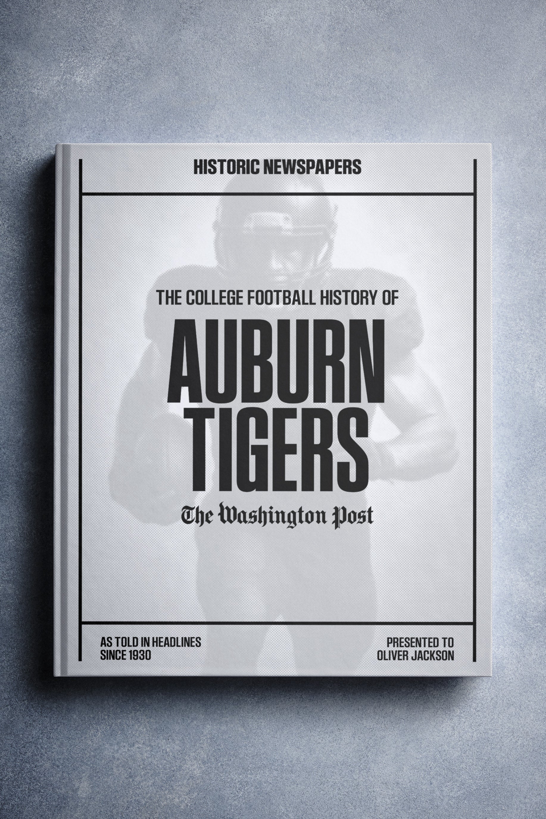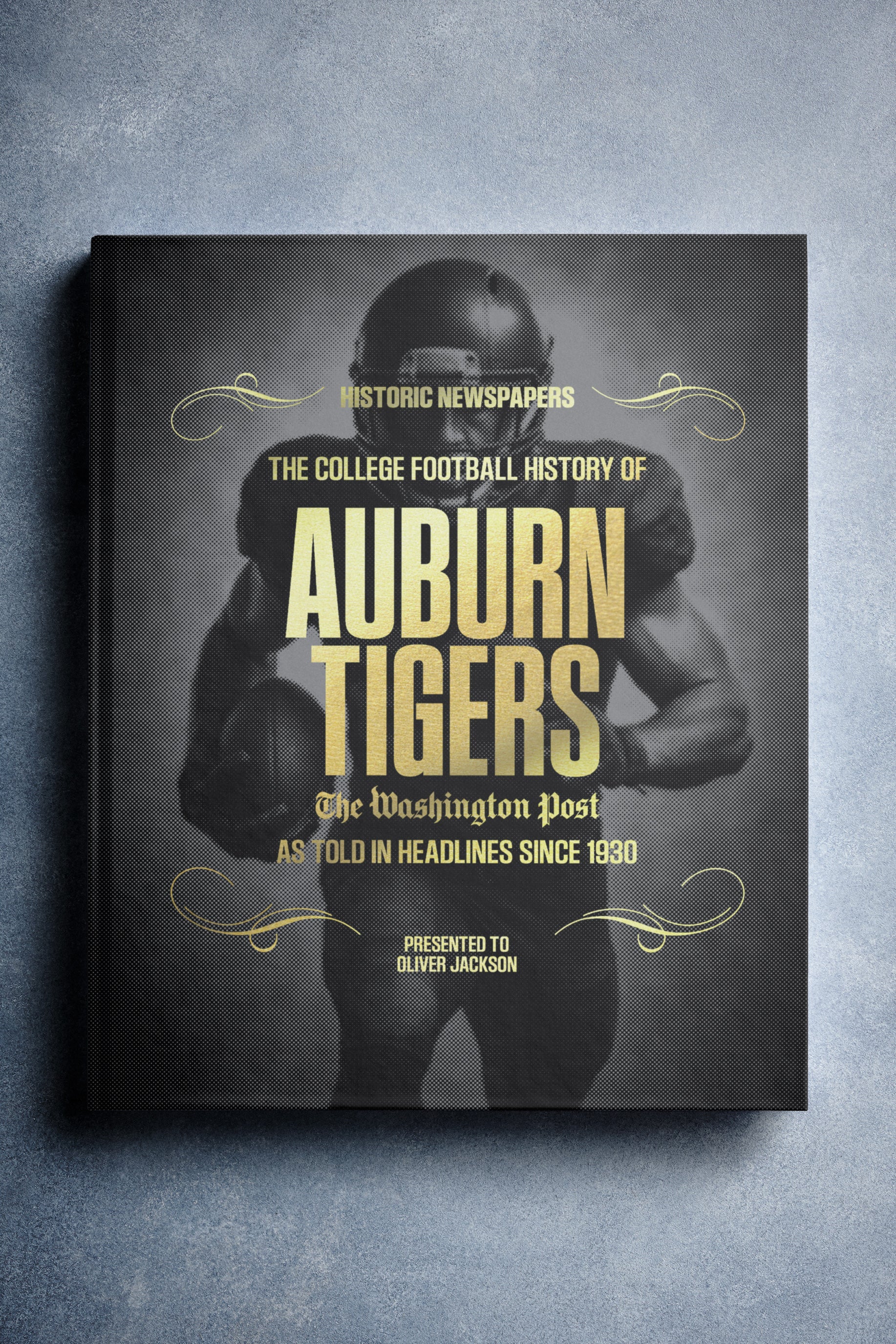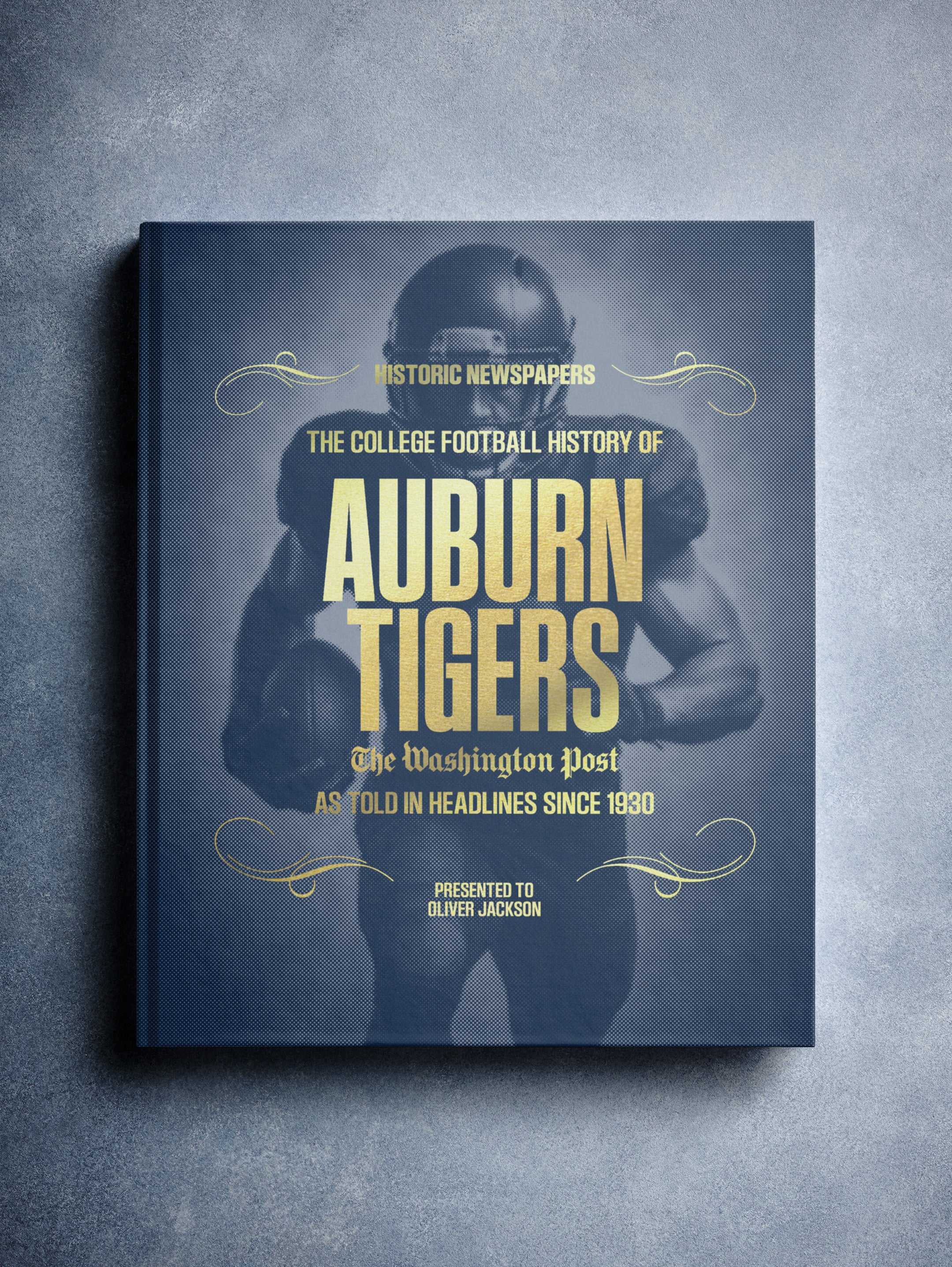 This coffee-table book features 140 pages of authentic Washington Post newspaper reports about The History of Auburn Tigers College Football. It comes with a choice of covers and the option to have the recipient’s name printed on the cover for free.