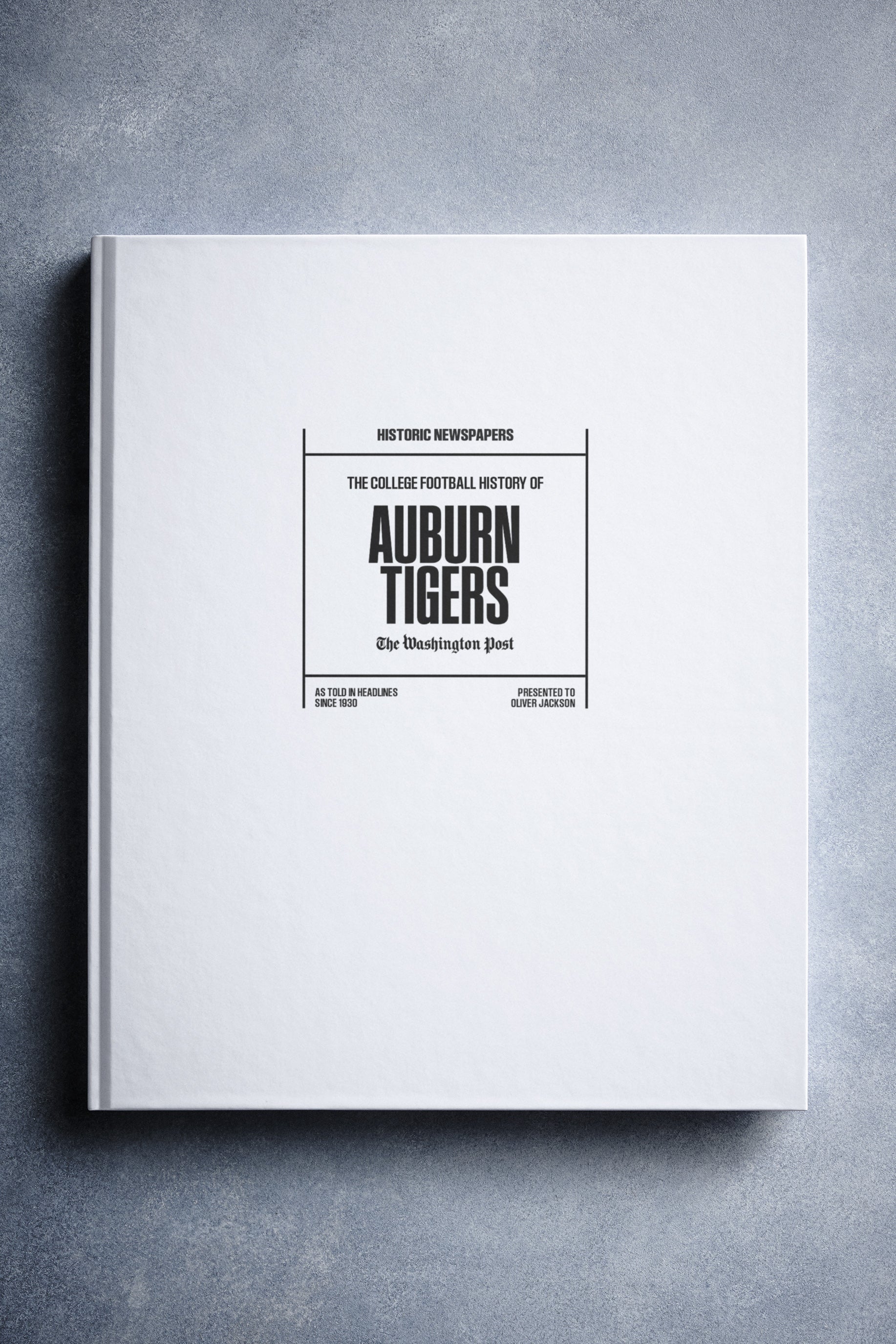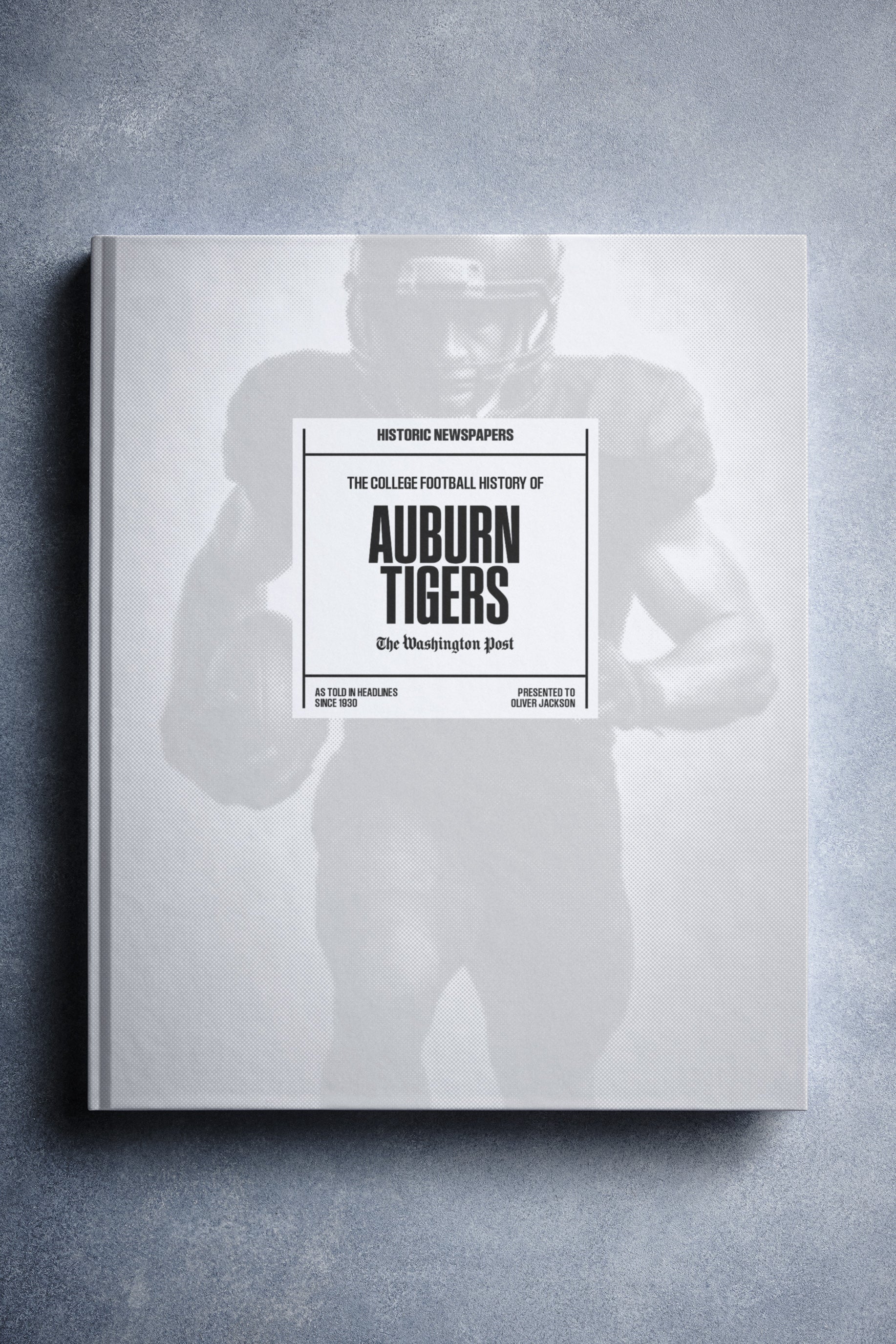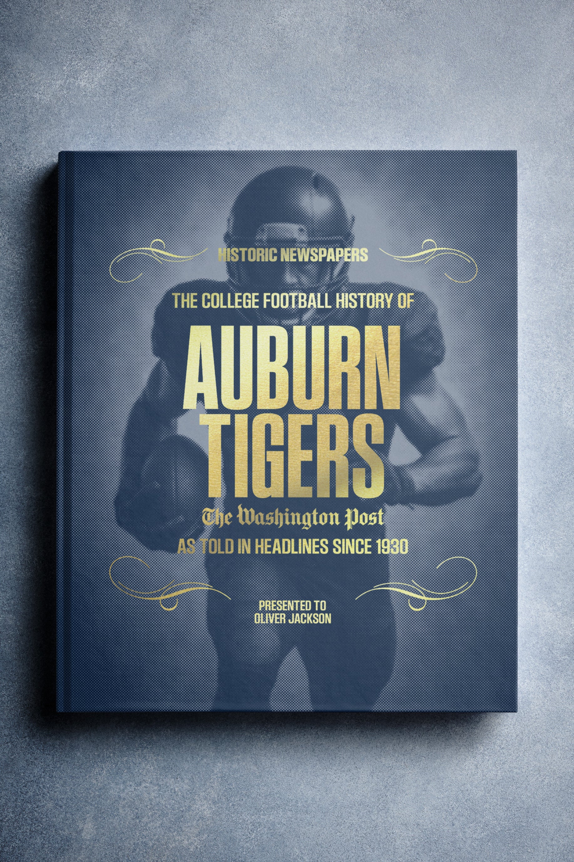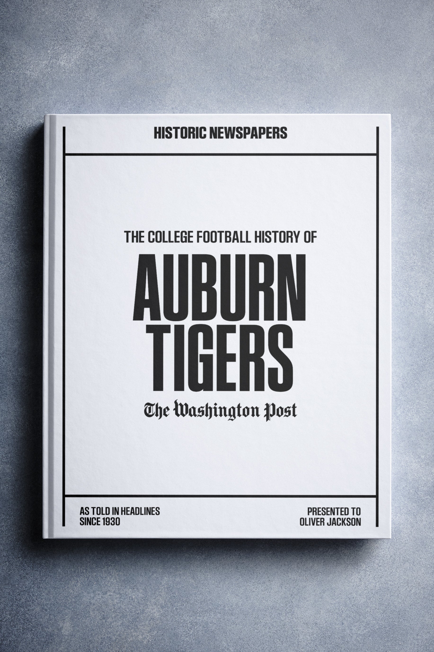 This coffee-table book features 140 pages of authentic Washington Post newspaper reports about The History of Auburn Tigers College Football. It comes with a choice of covers and the option to have the recipient’s name printed on the cover for free.