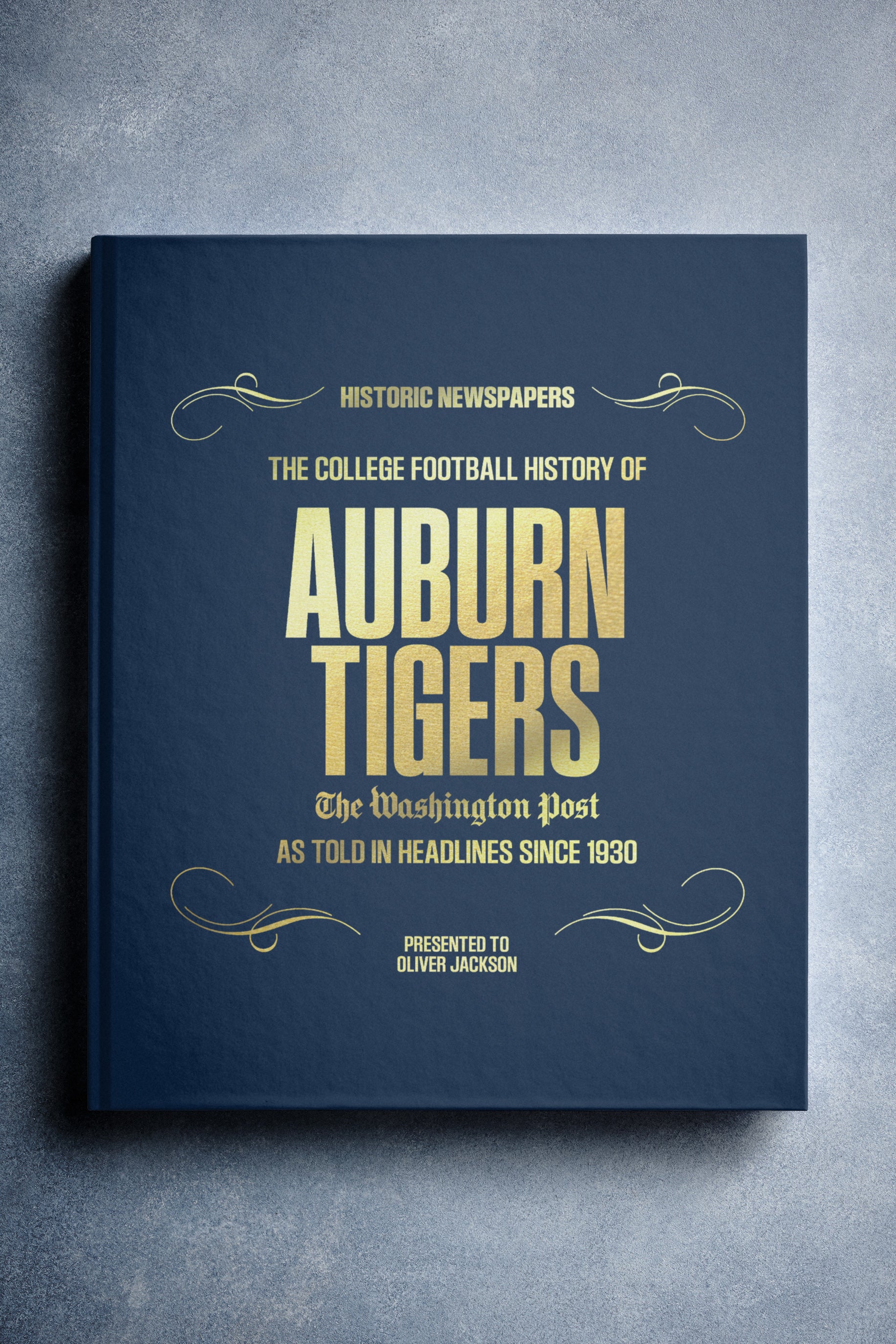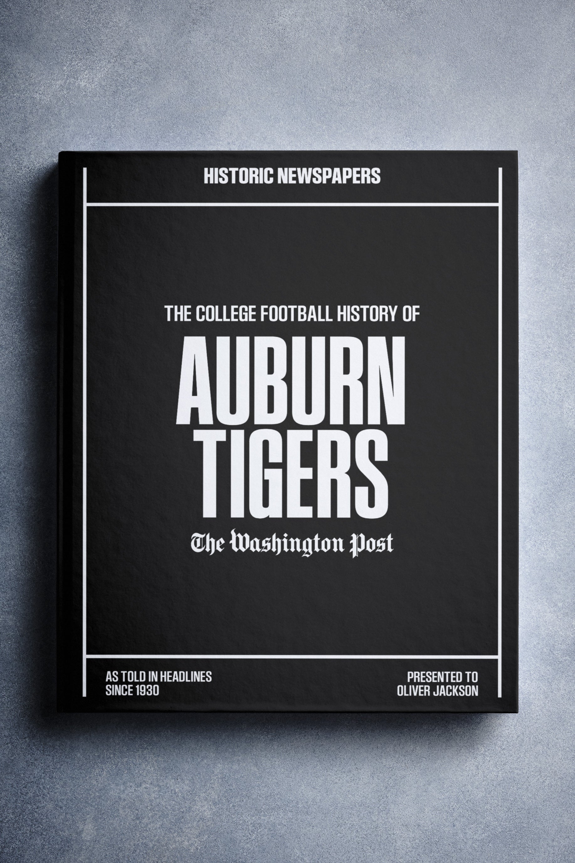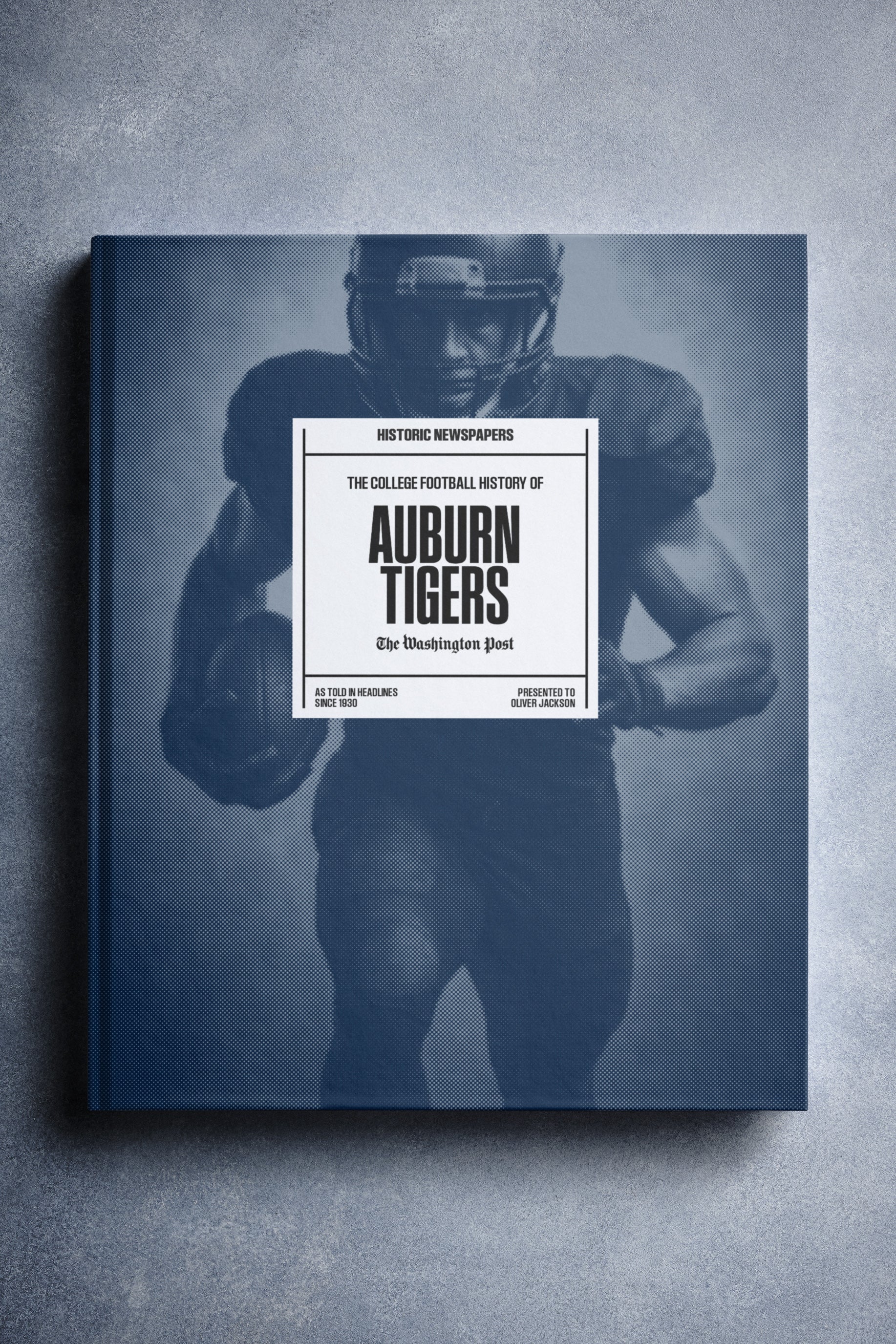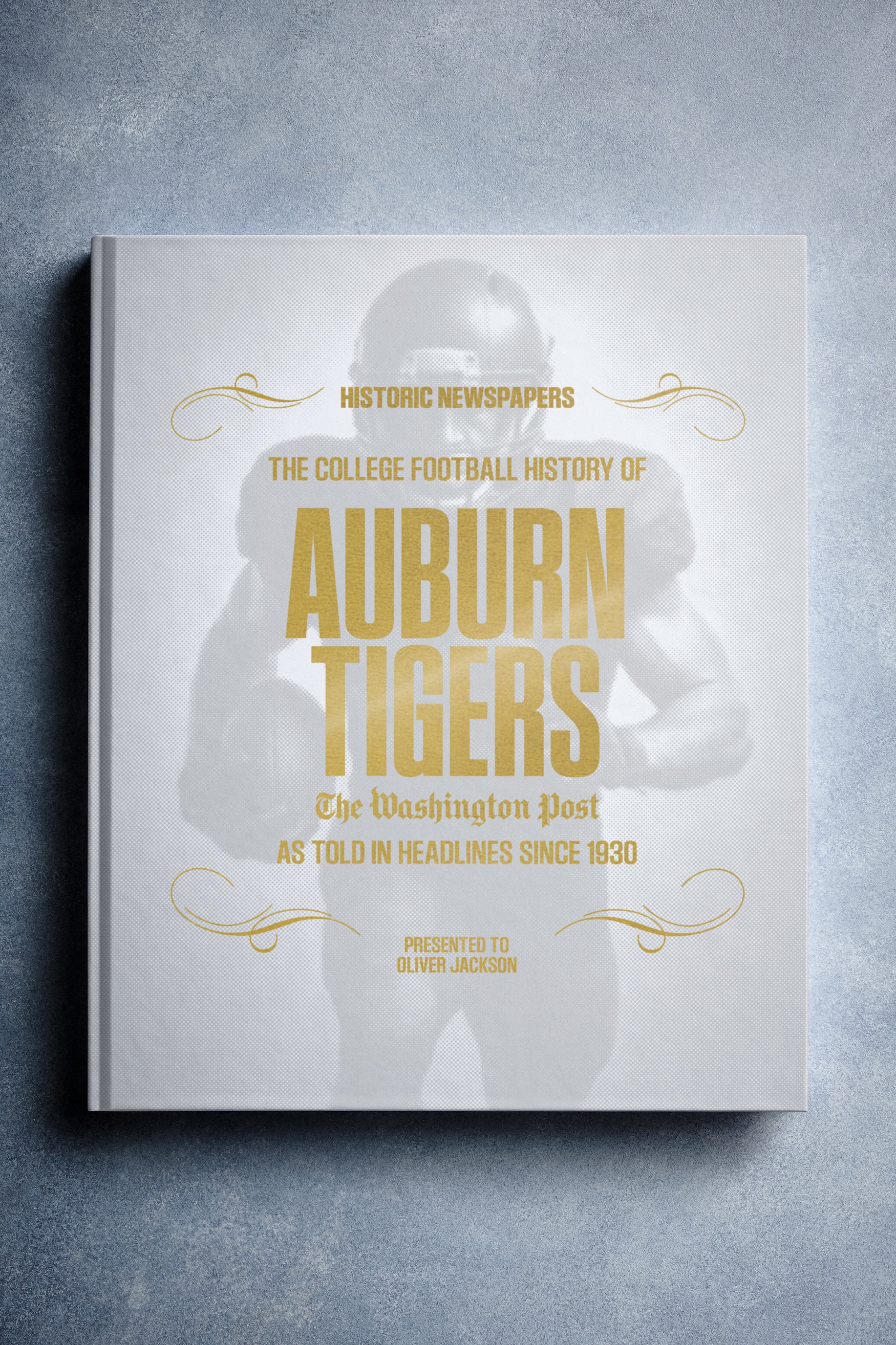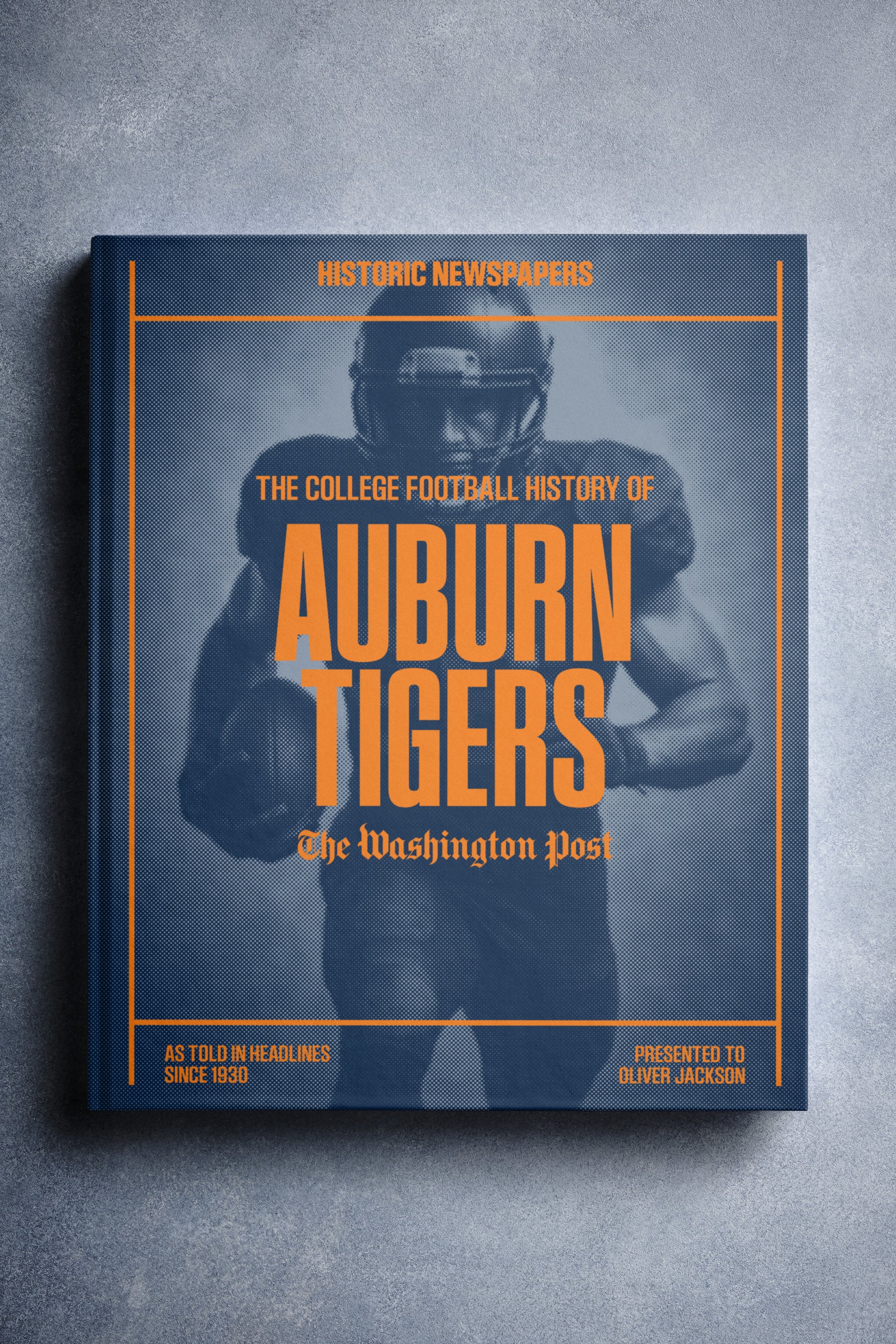 This coffee-table book features 140 pages of authentic Washington Post newspaper reports about The History of Auburn Tigers College Football. It comes with a choice of covers and the option to have the recipient’s name printed on the cover for free.