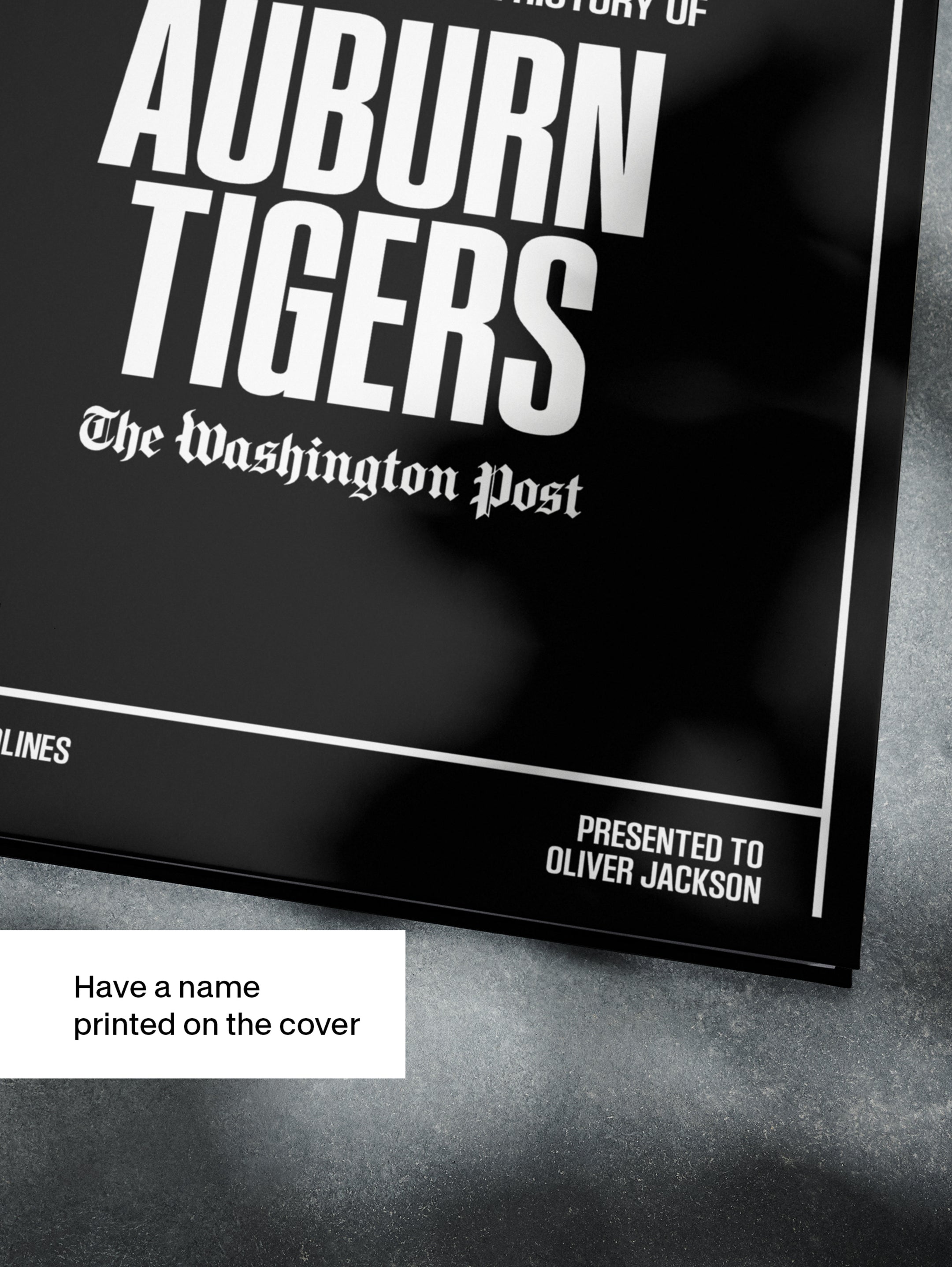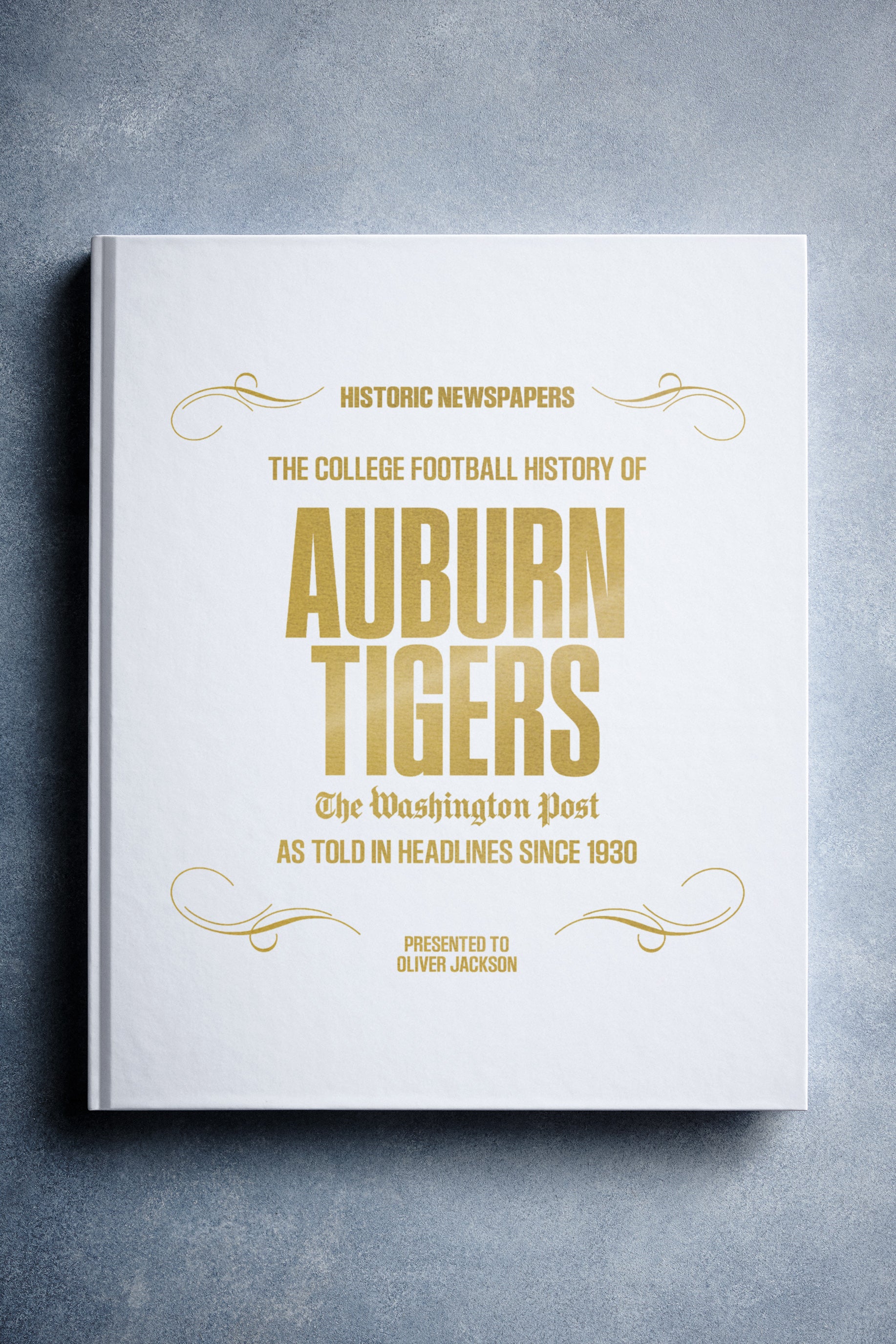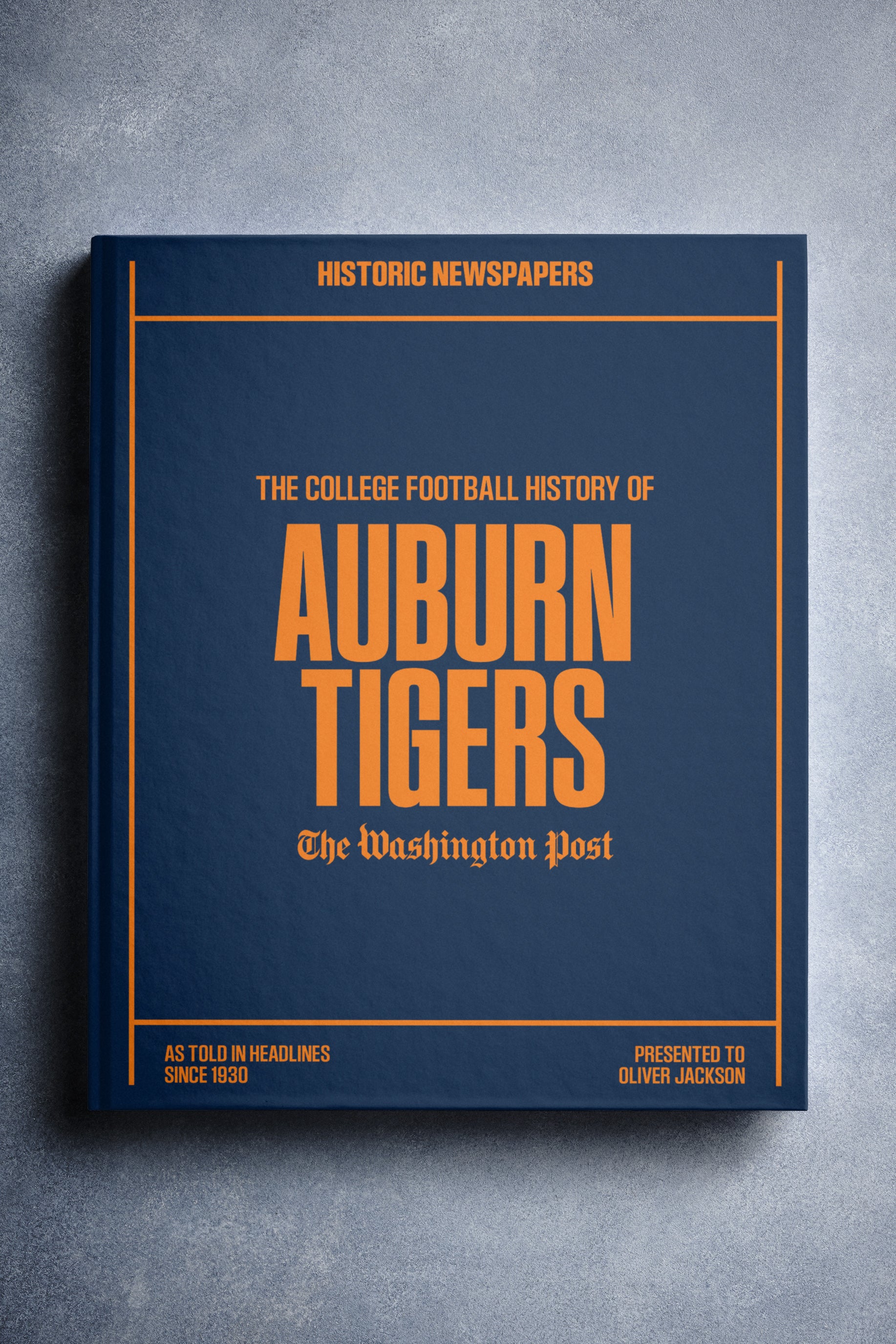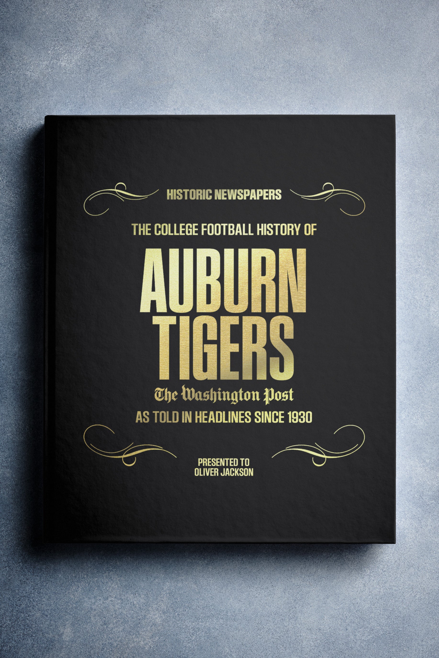 This coffee-table book features 140 pages of authentic Washington Post newspaper reports about The History of Auburn Tigers College Football. It comes with a choice of covers and the option to have the recipient’s name printed on the cover for free.