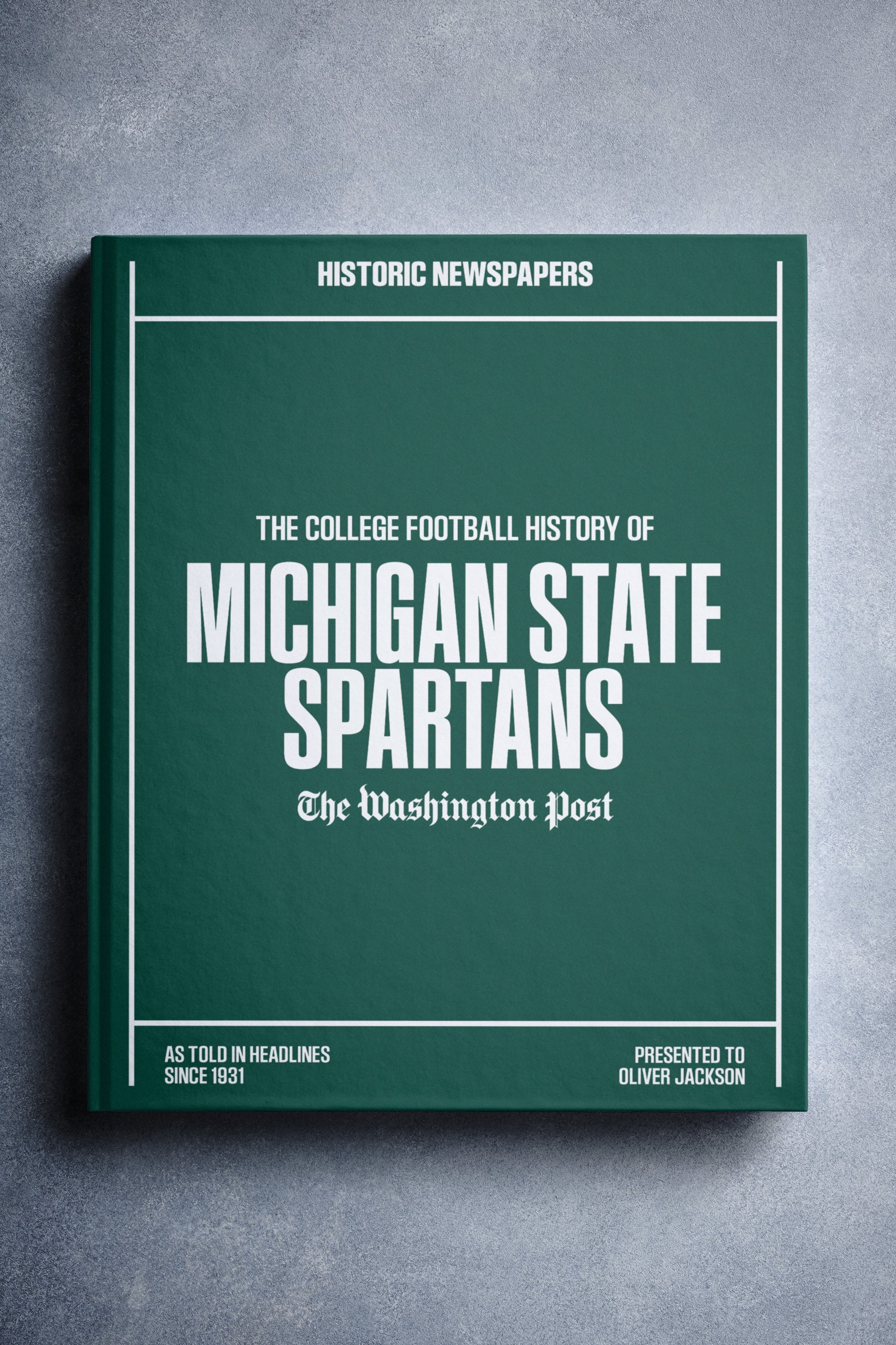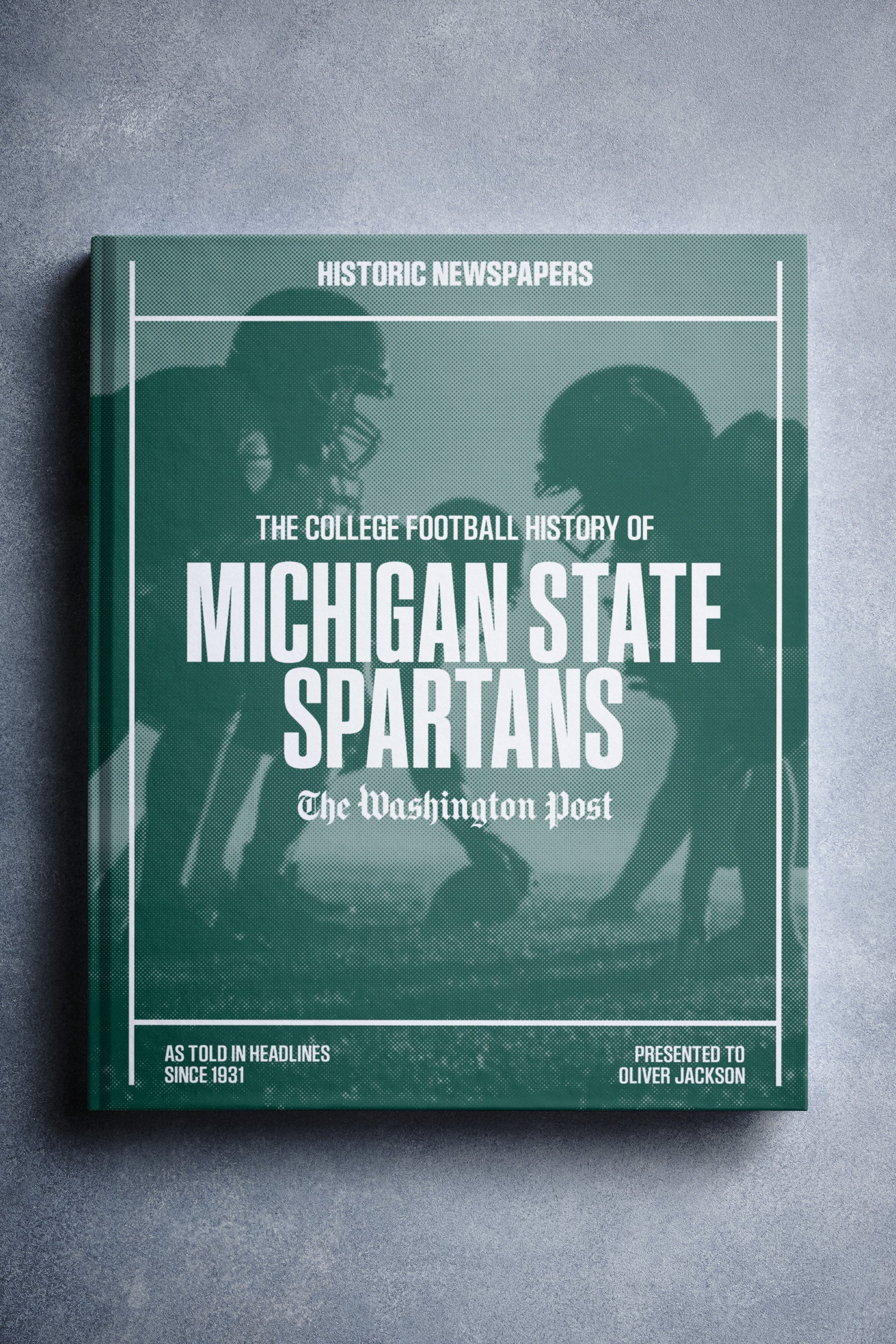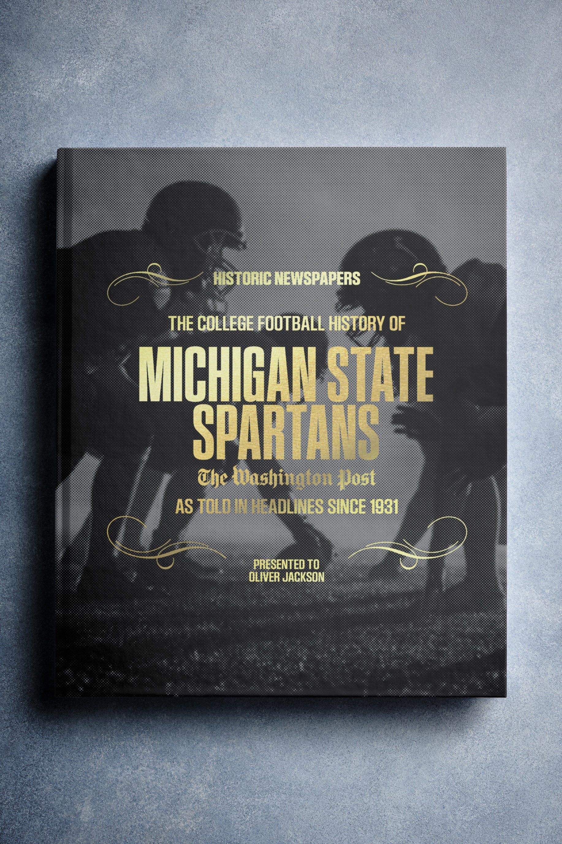 This coffee-table book features over 130 pages of authentic Washington Post newspaper reports about The History of Michigan State Spartans College Football. It comes with a choice of covers and the option to have the recipient’s name printed on the cover for free.