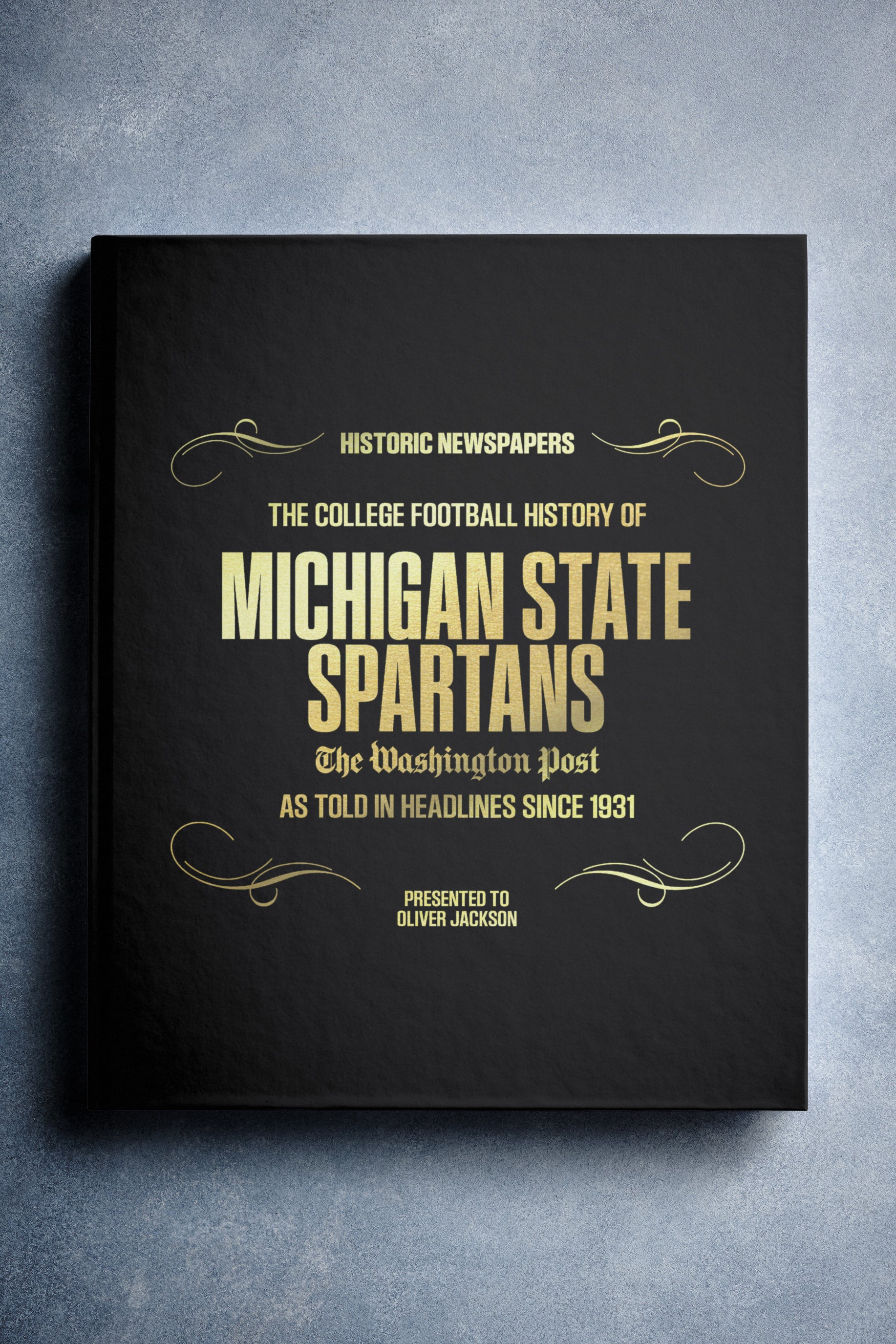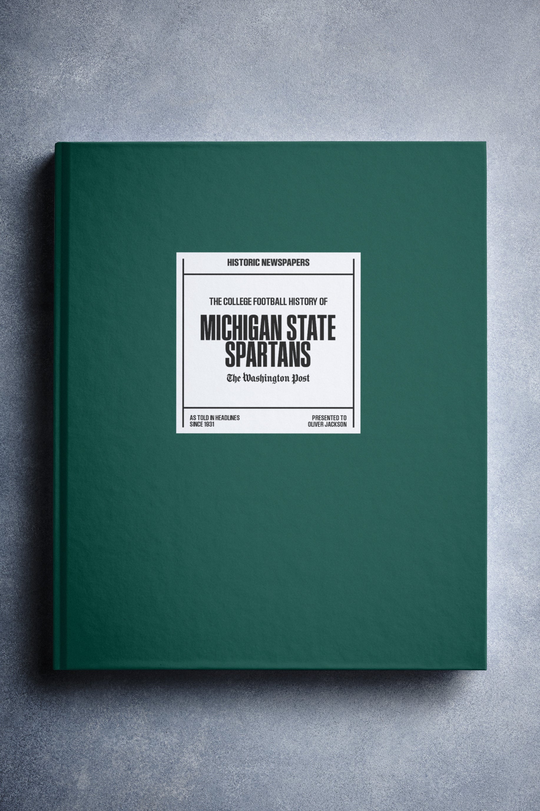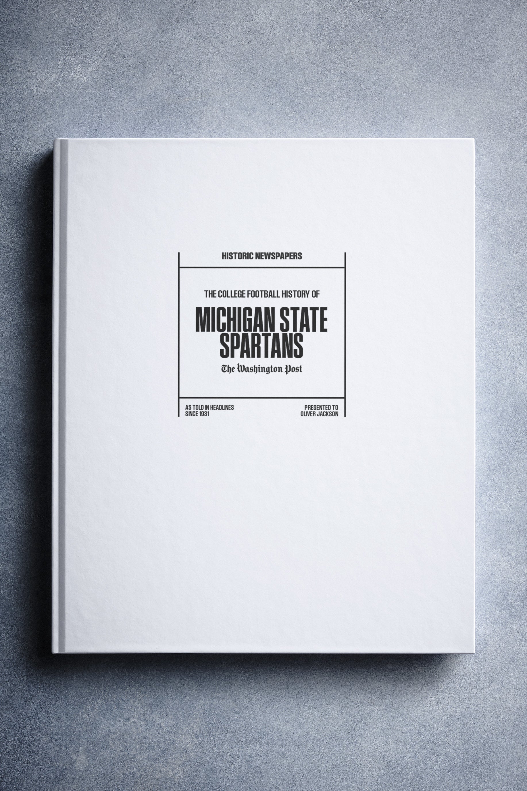 This coffee-table book features over 130 pages of authentic Washington Post newspaper reports about The History of Michigan State Spartans College Football. It comes with a choice of covers and the option to have the recipient’s name printed on the cover for free.