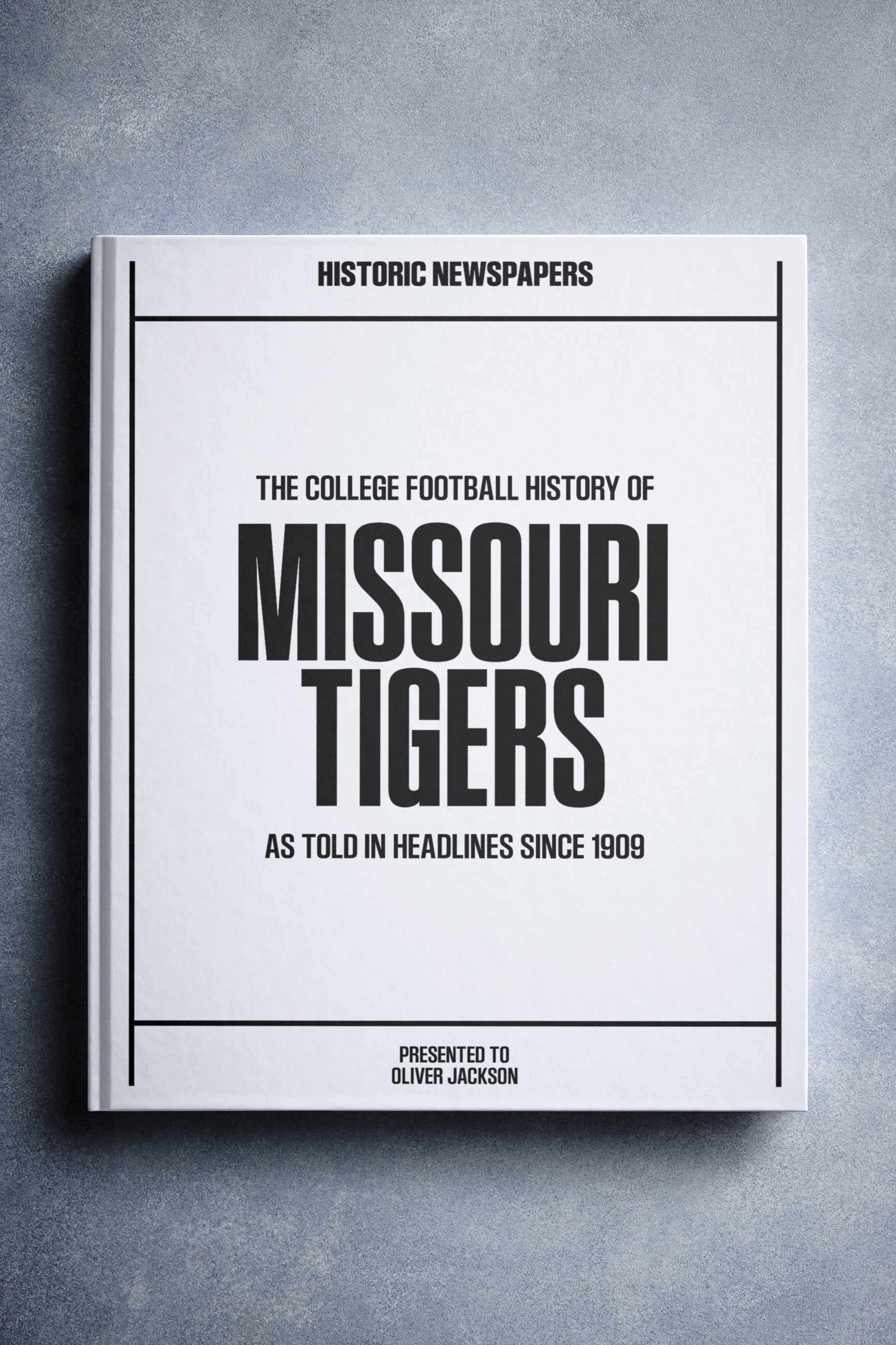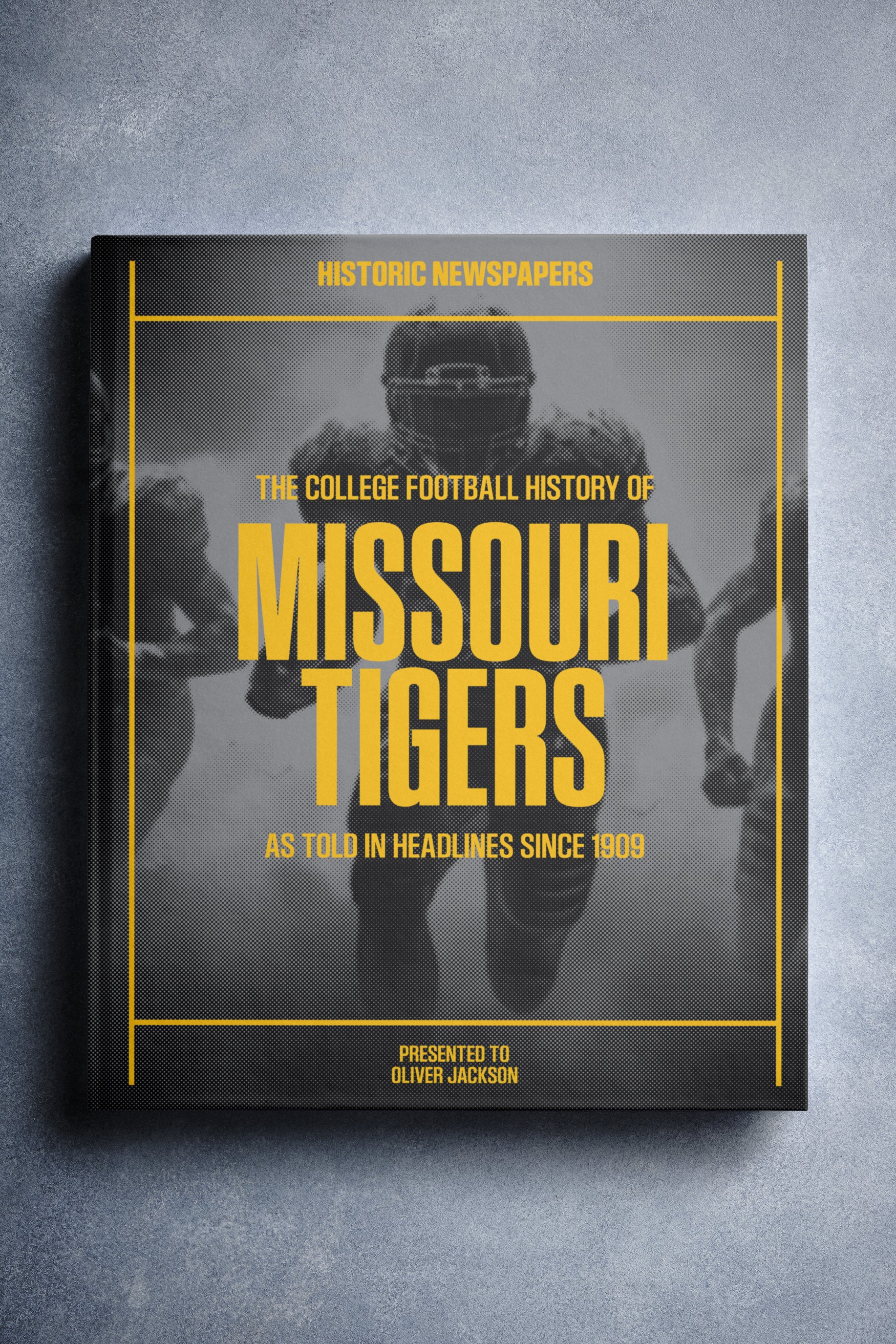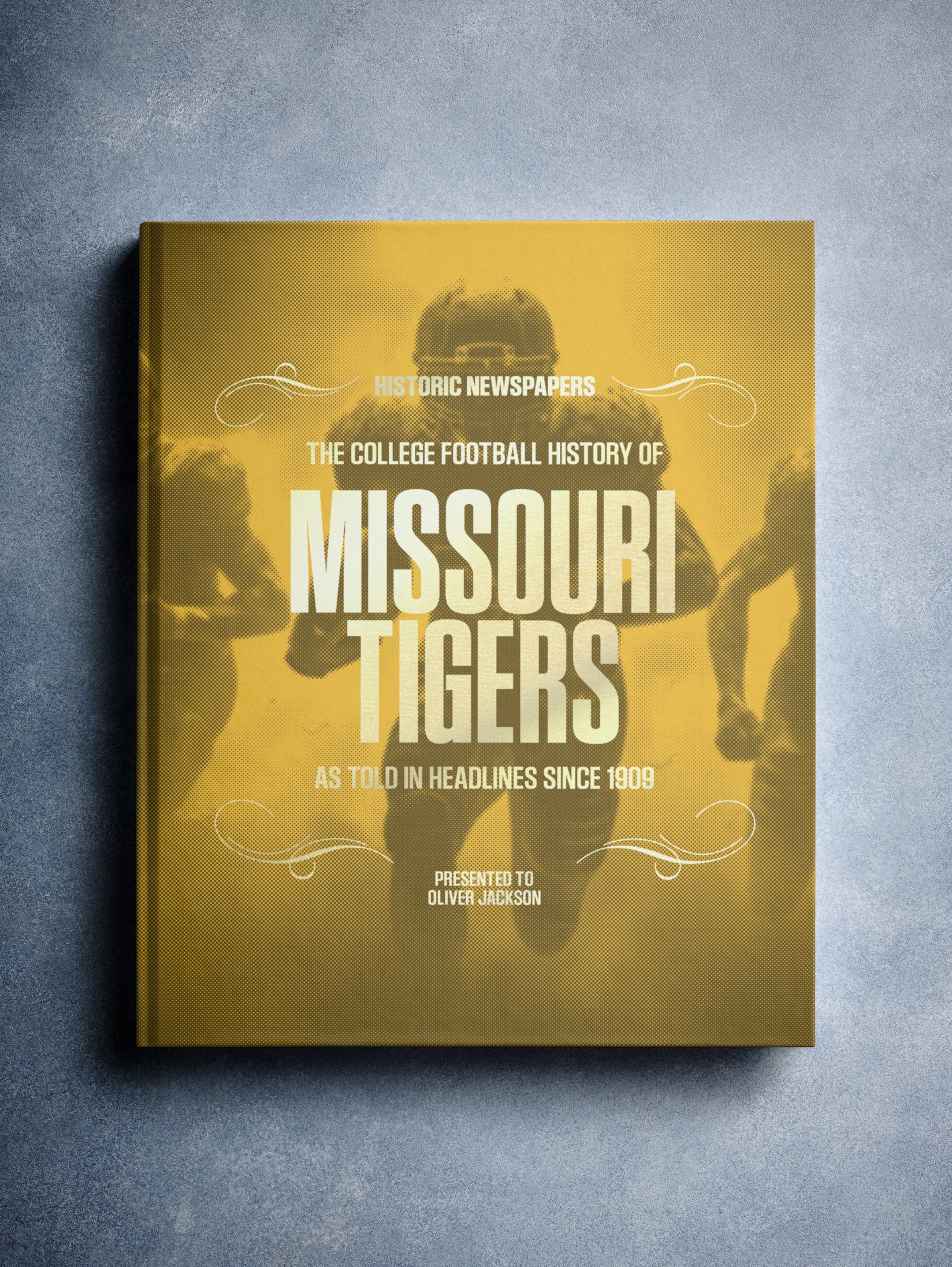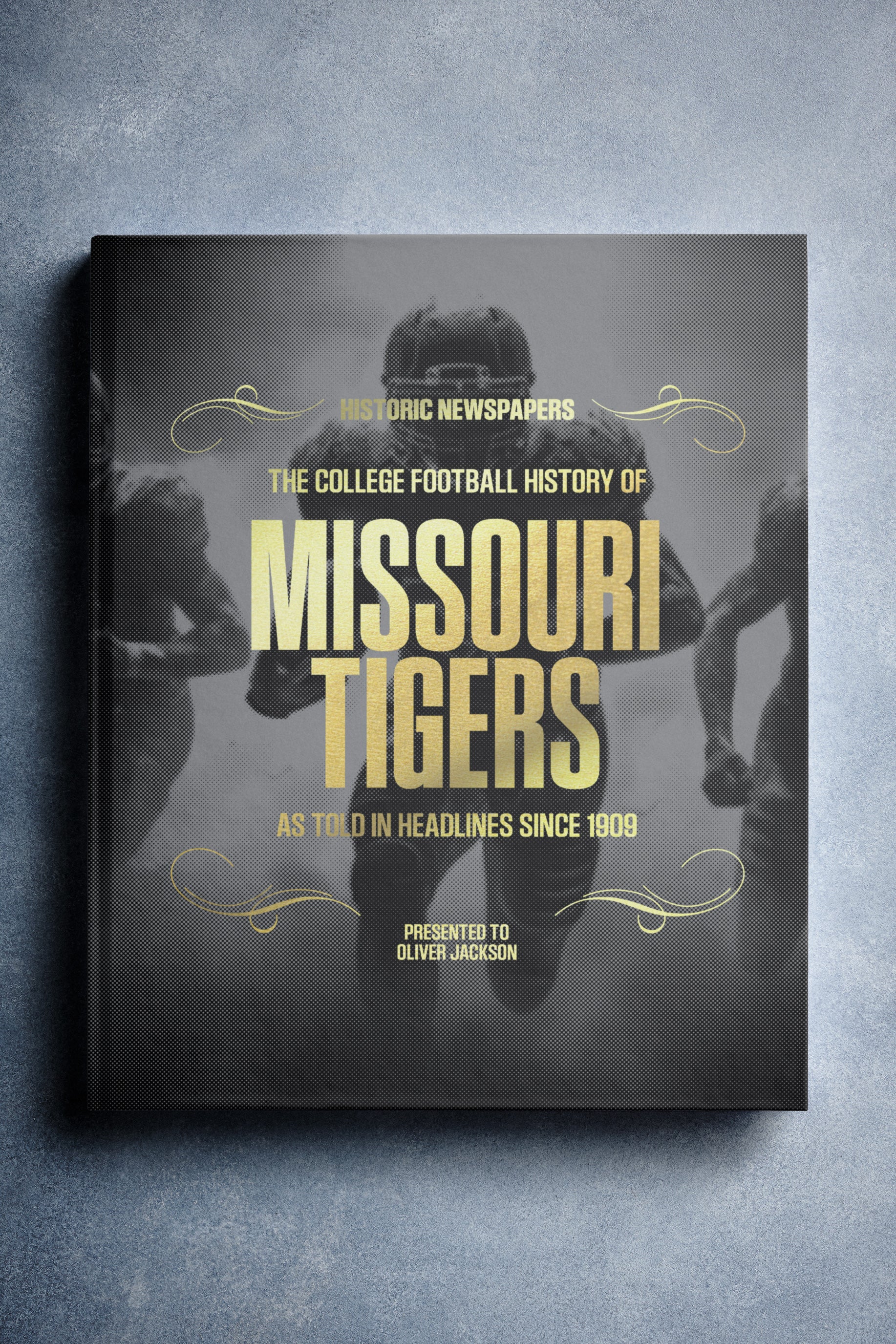 This coffee-table book features 150 pages of authentic newspaper reports about The History of the Missouri Tigers College Football Team. It comes with a choice of covers and the option to have the recipient’s name printed on the cover for free.