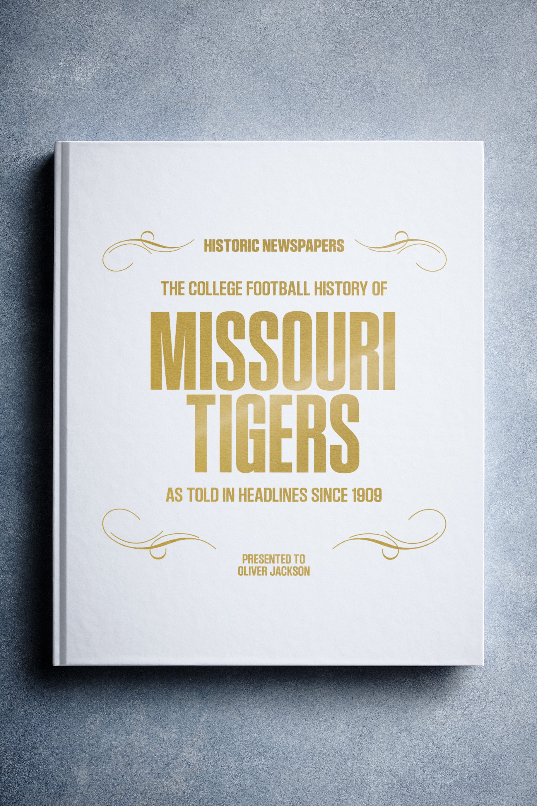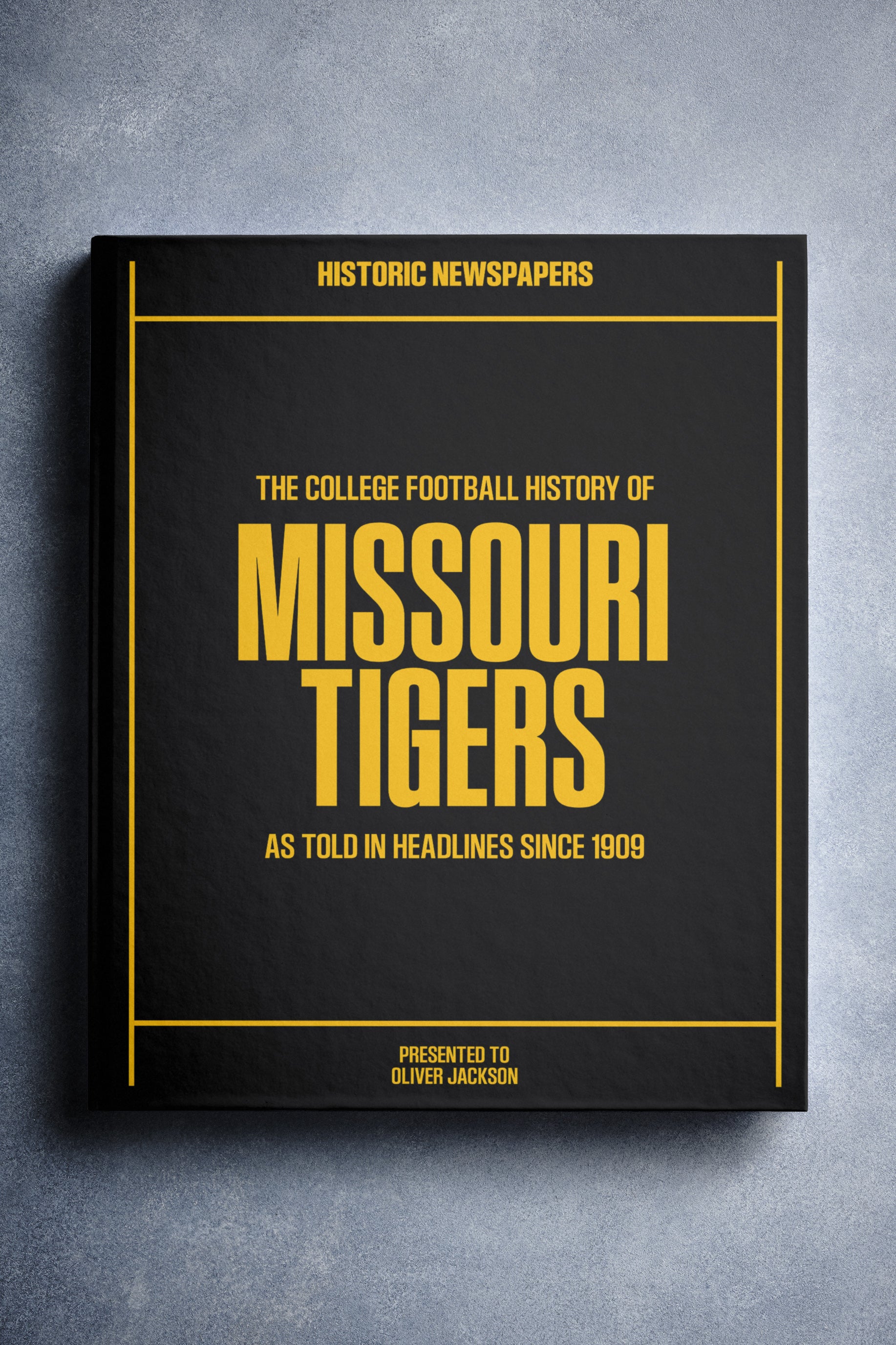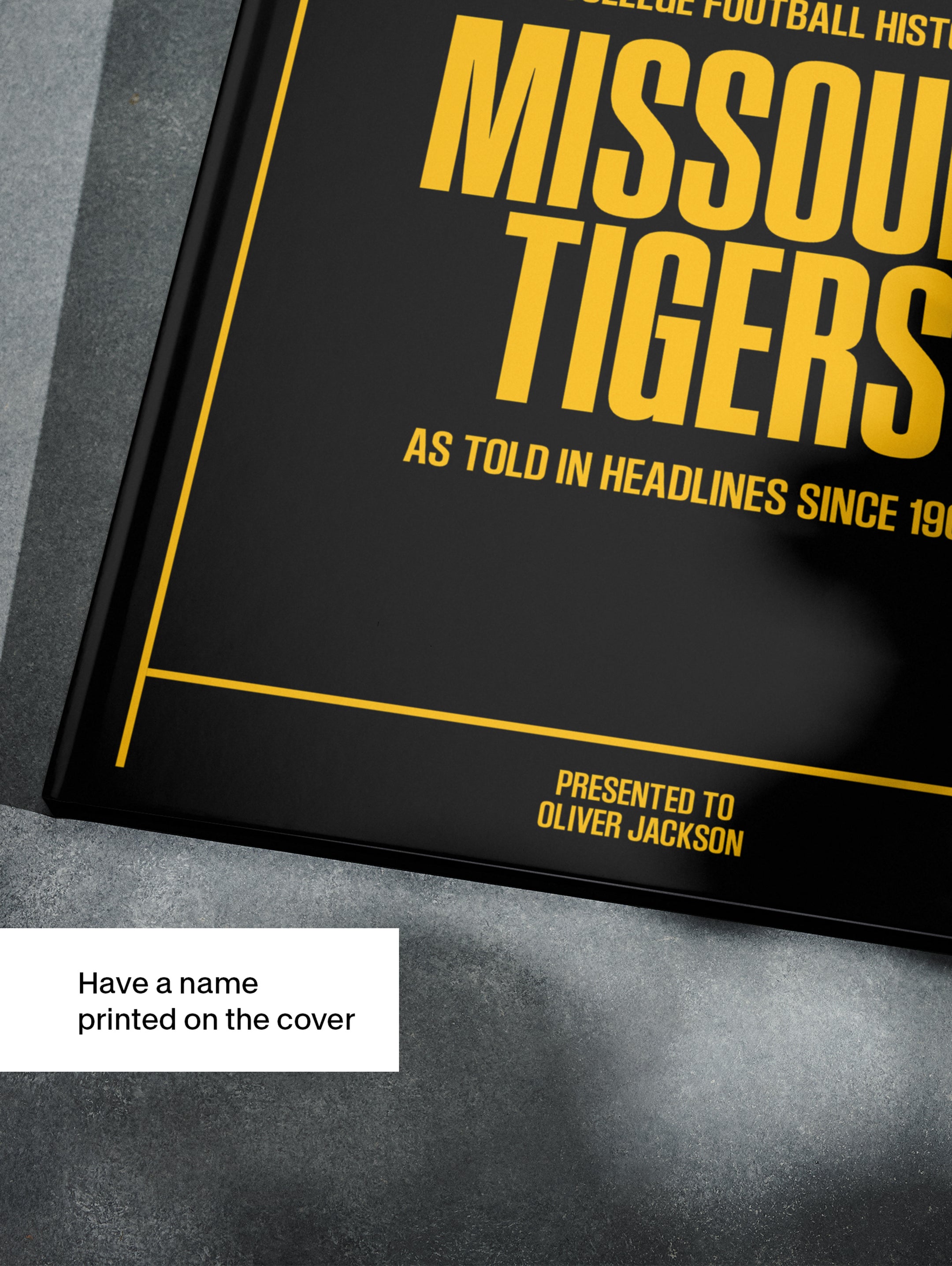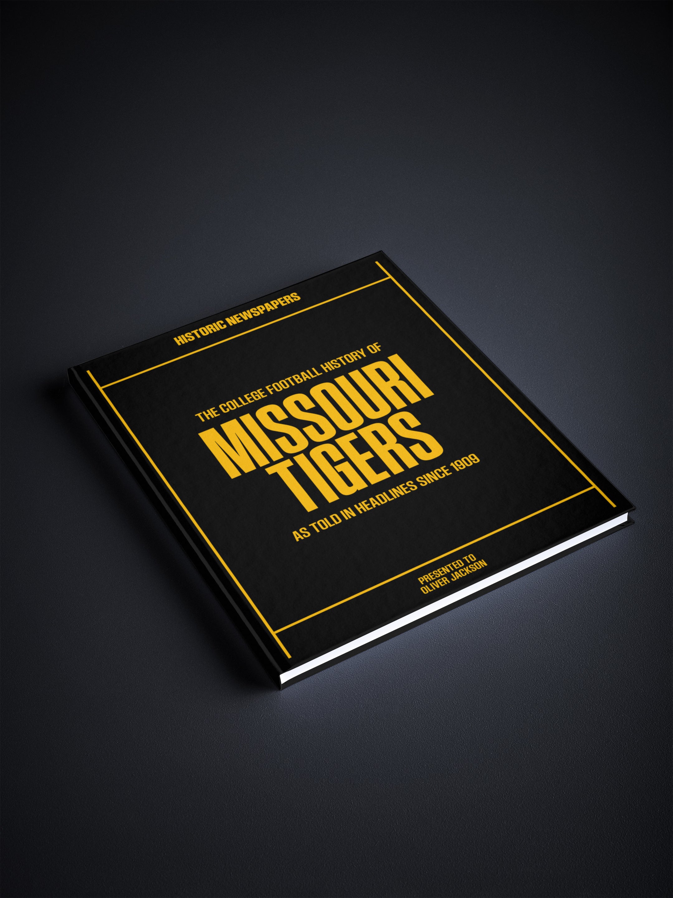 This coffee-table book features 150 pages of authentic newspaper reports about The History of the Missouri Tigers College Football Team. It comes with a choice of covers and the option to have the recipient’s name printed on the cover for free.