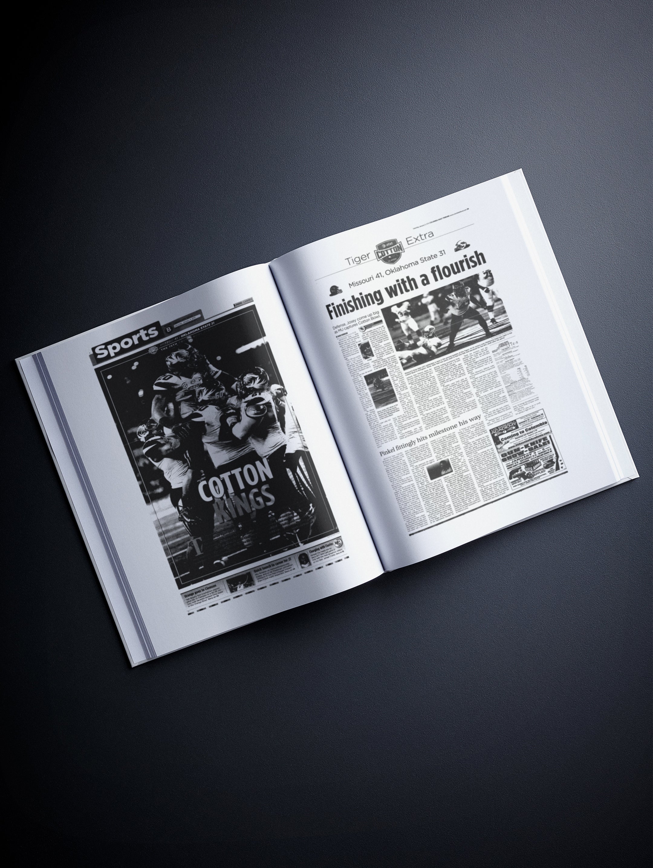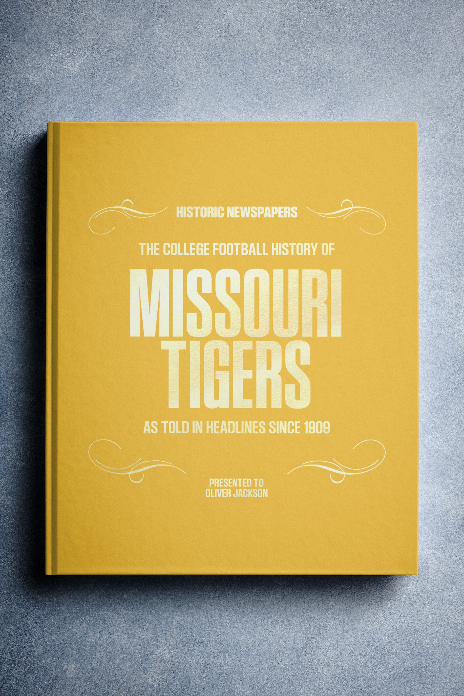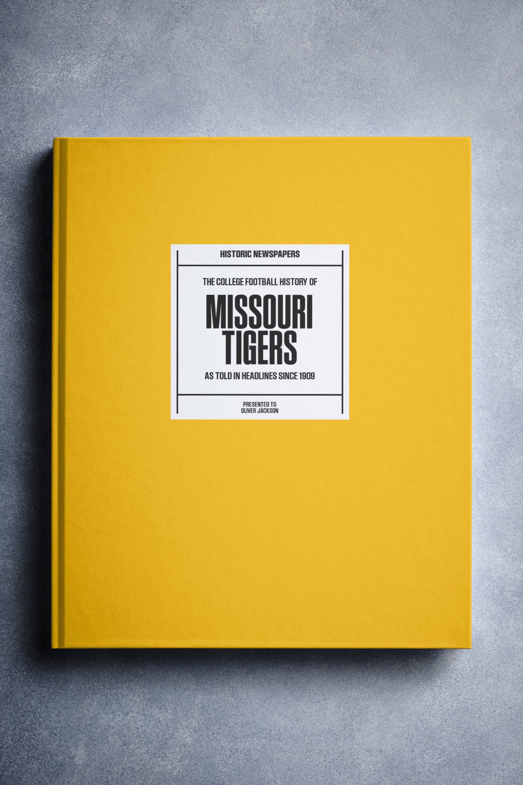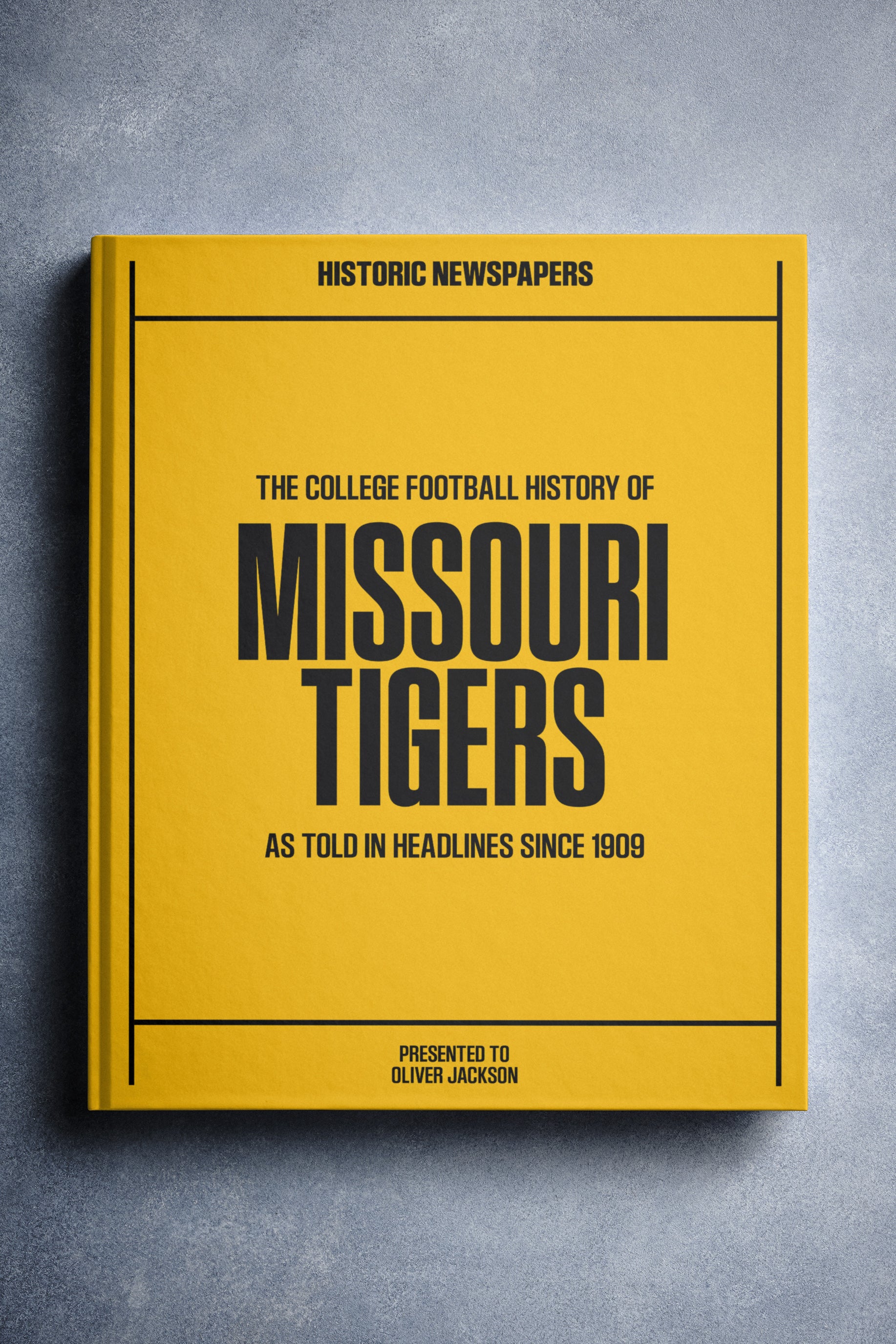 This coffee-table book features 150 pages of authentic newspaper reports about The History of the Missouri Tigers College Football Team. It comes with a choice of covers and the option to have the recipient’s name printed on the cover for free.