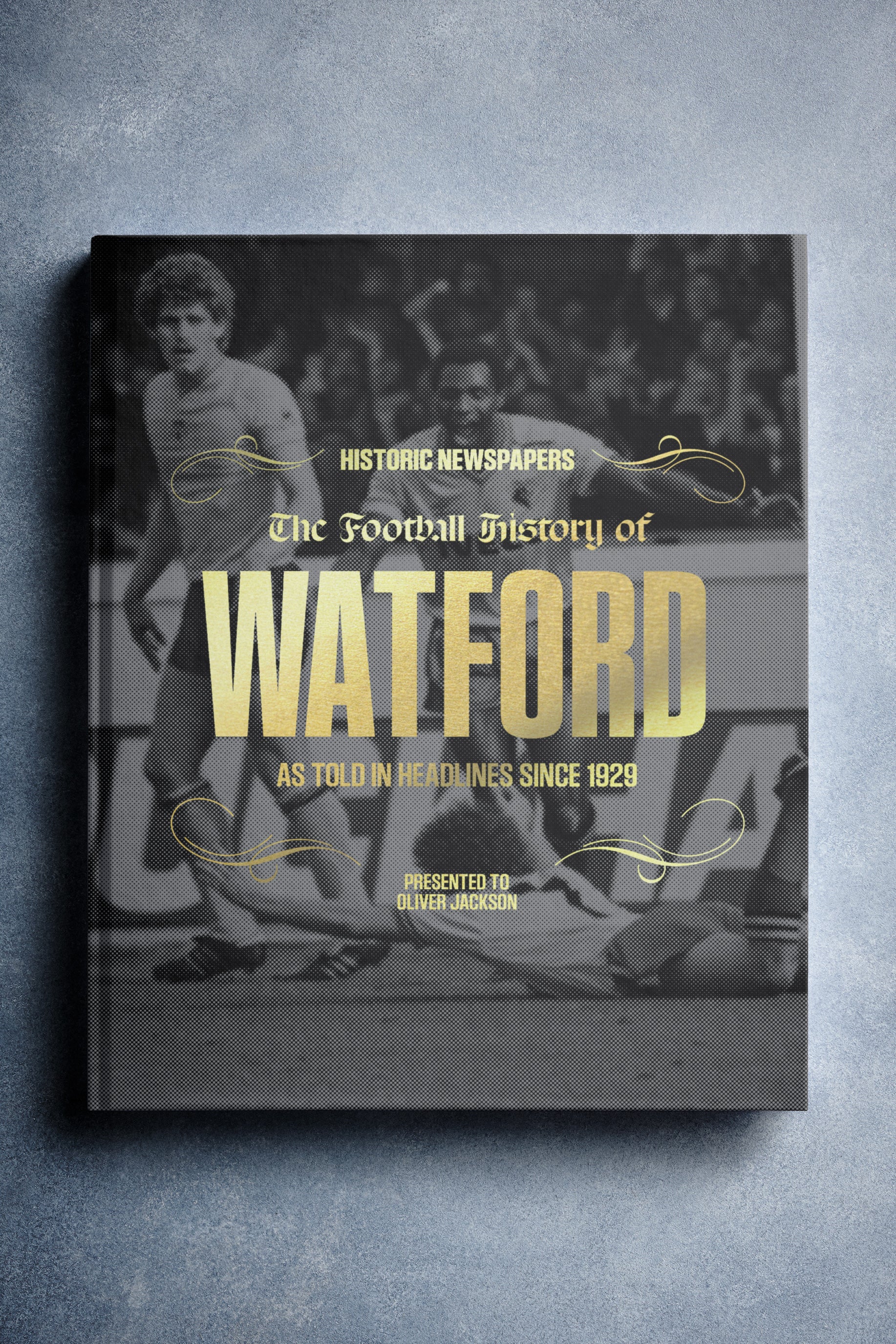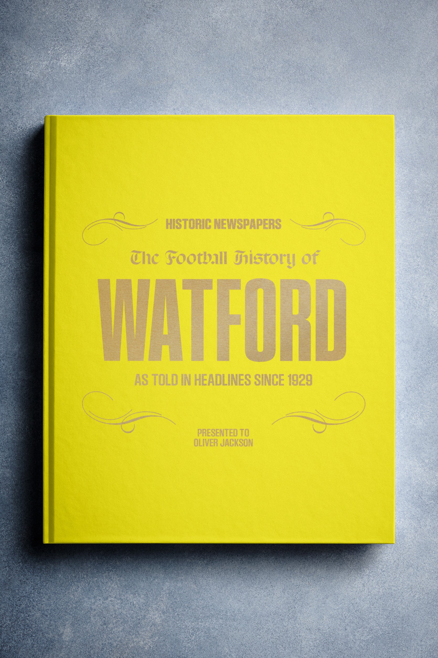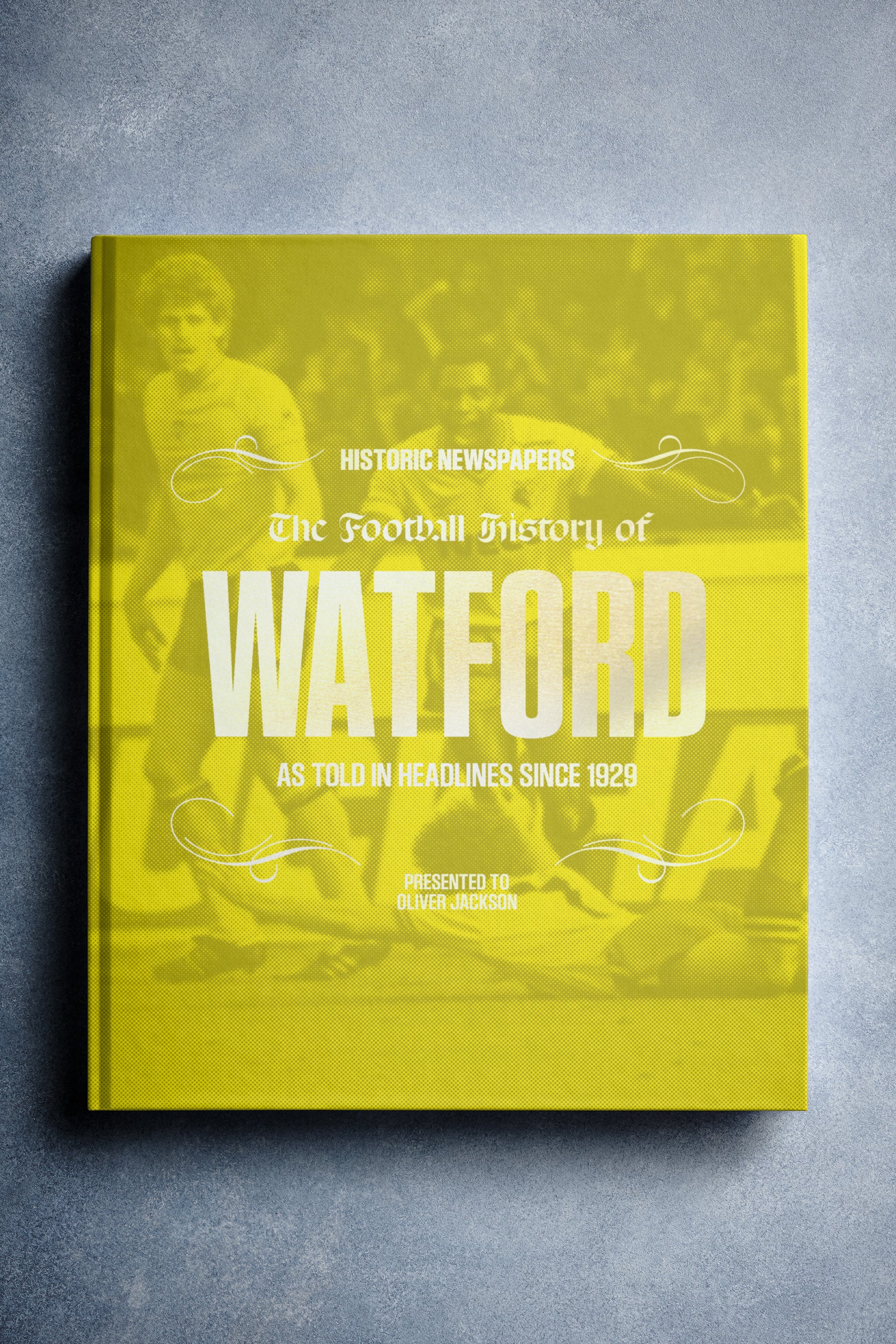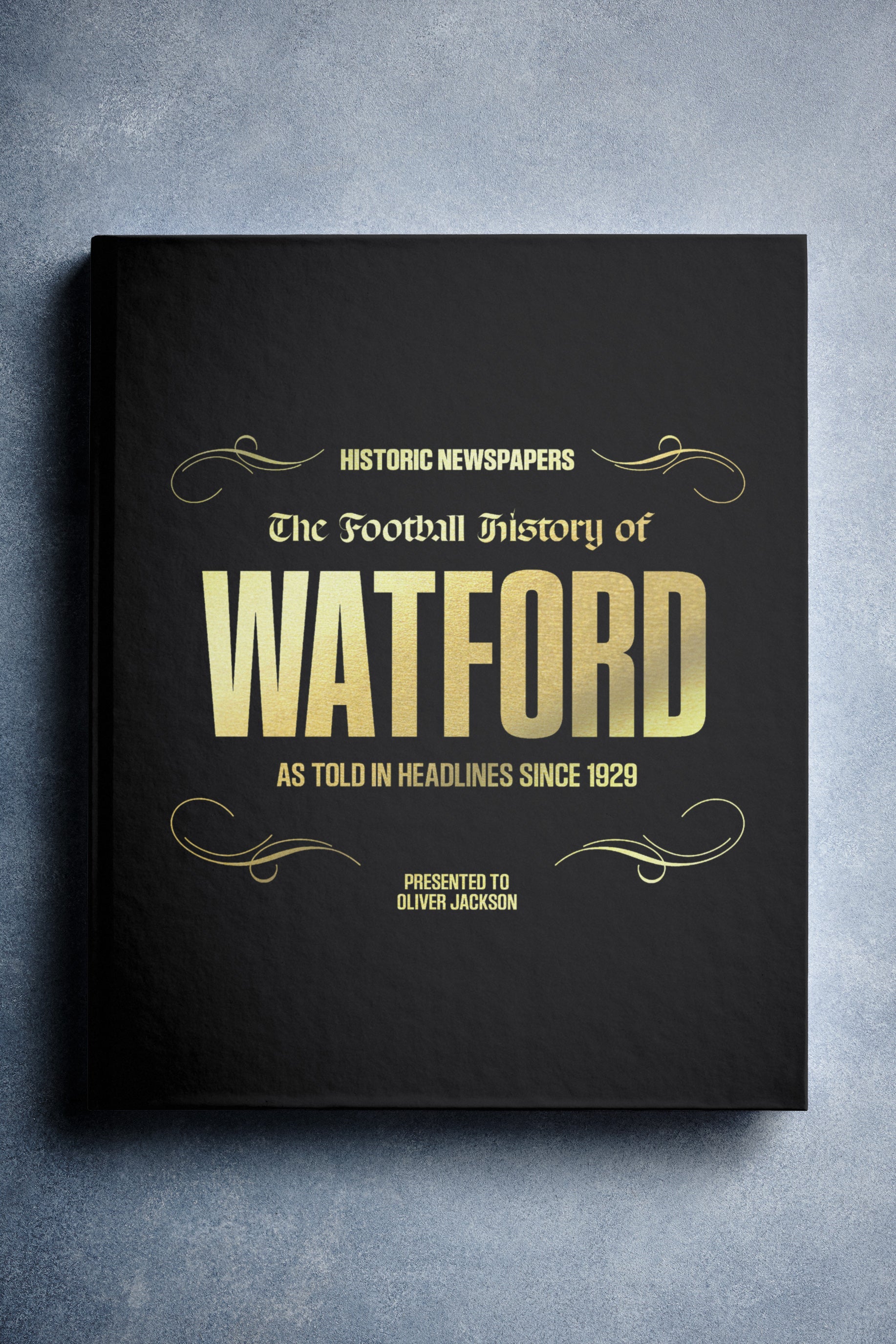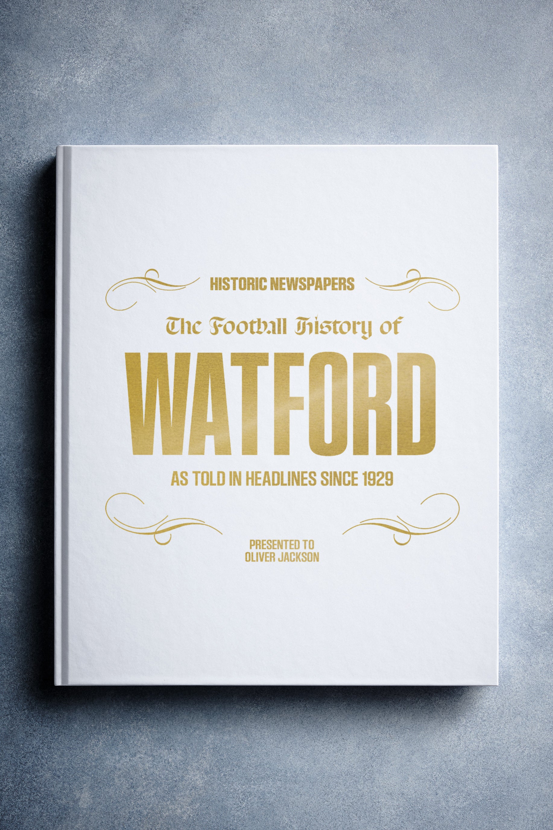 This personalised book features 140 pages of authentic newspaper football reports about Watford, from 1929 onwards. It comes with a choice of covers and the option to have the recipient’s name printed on the cover for free.