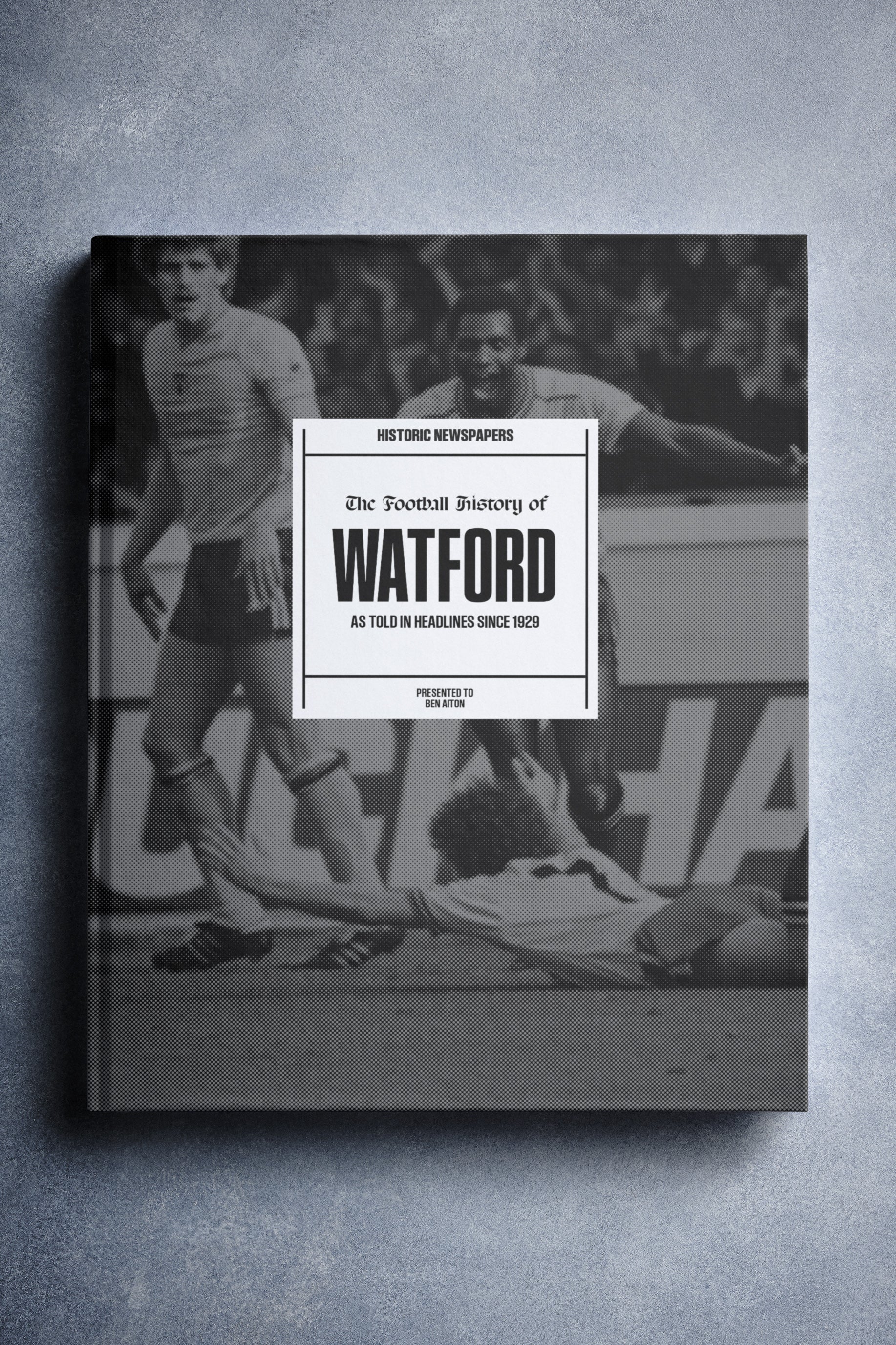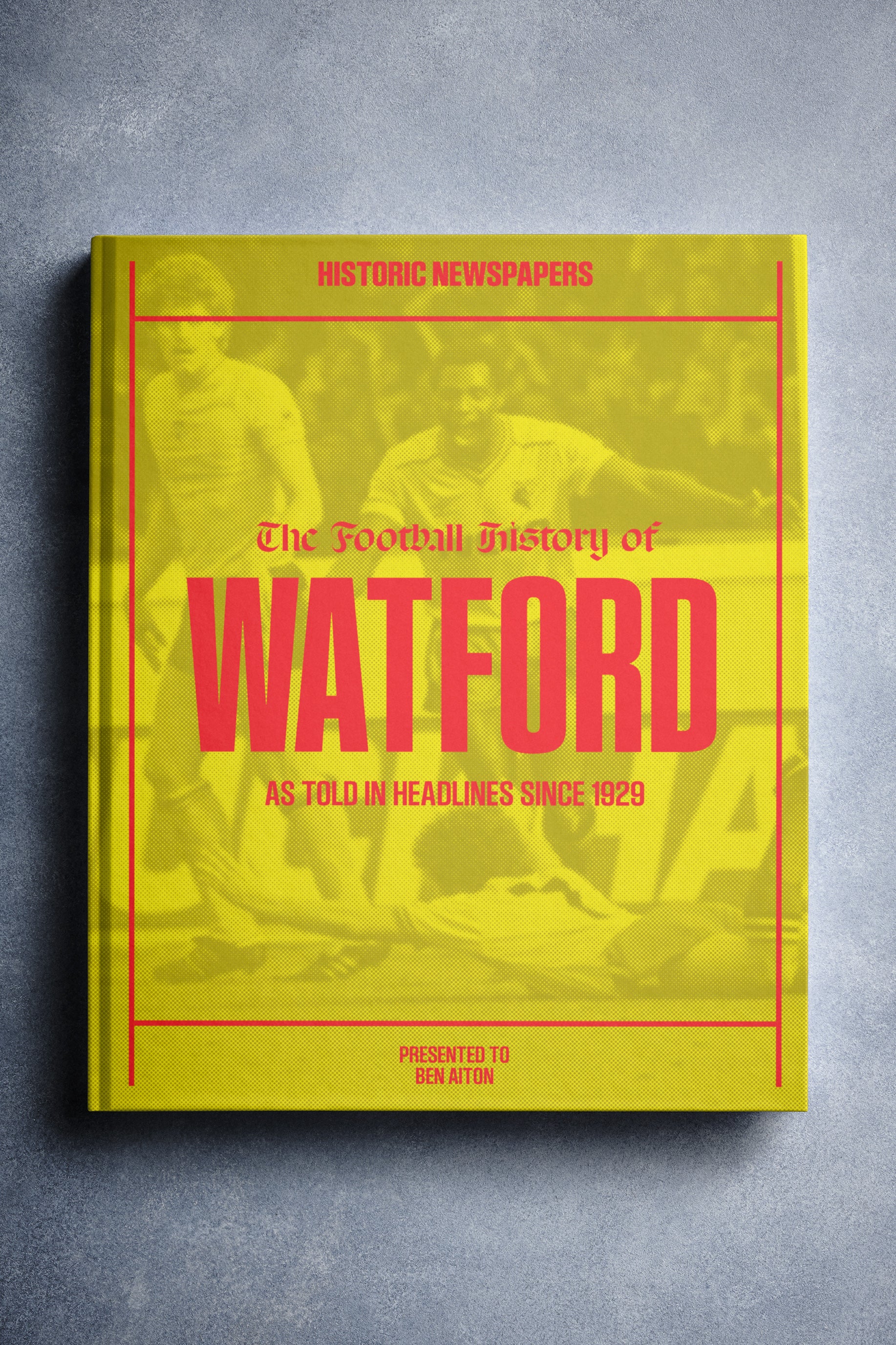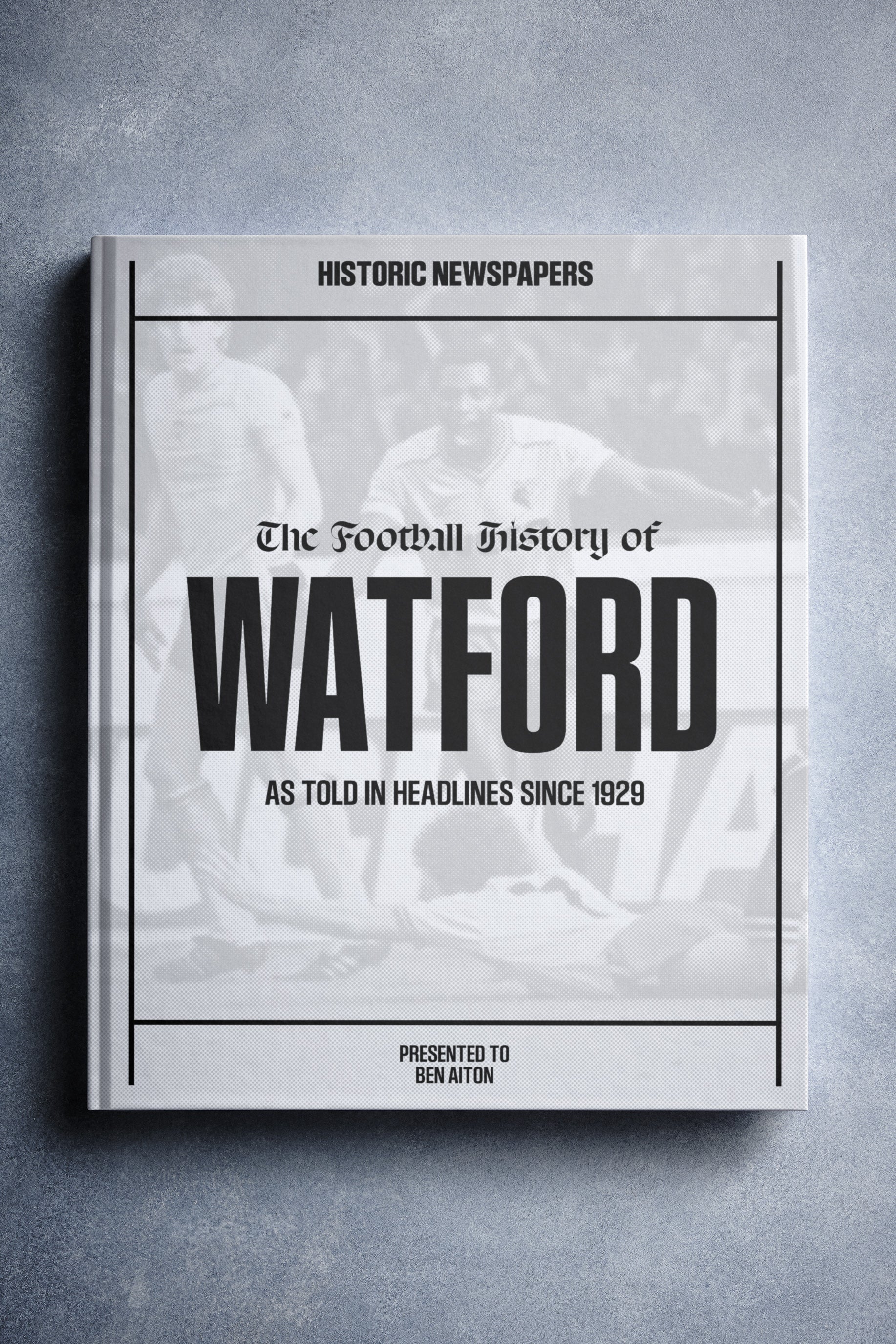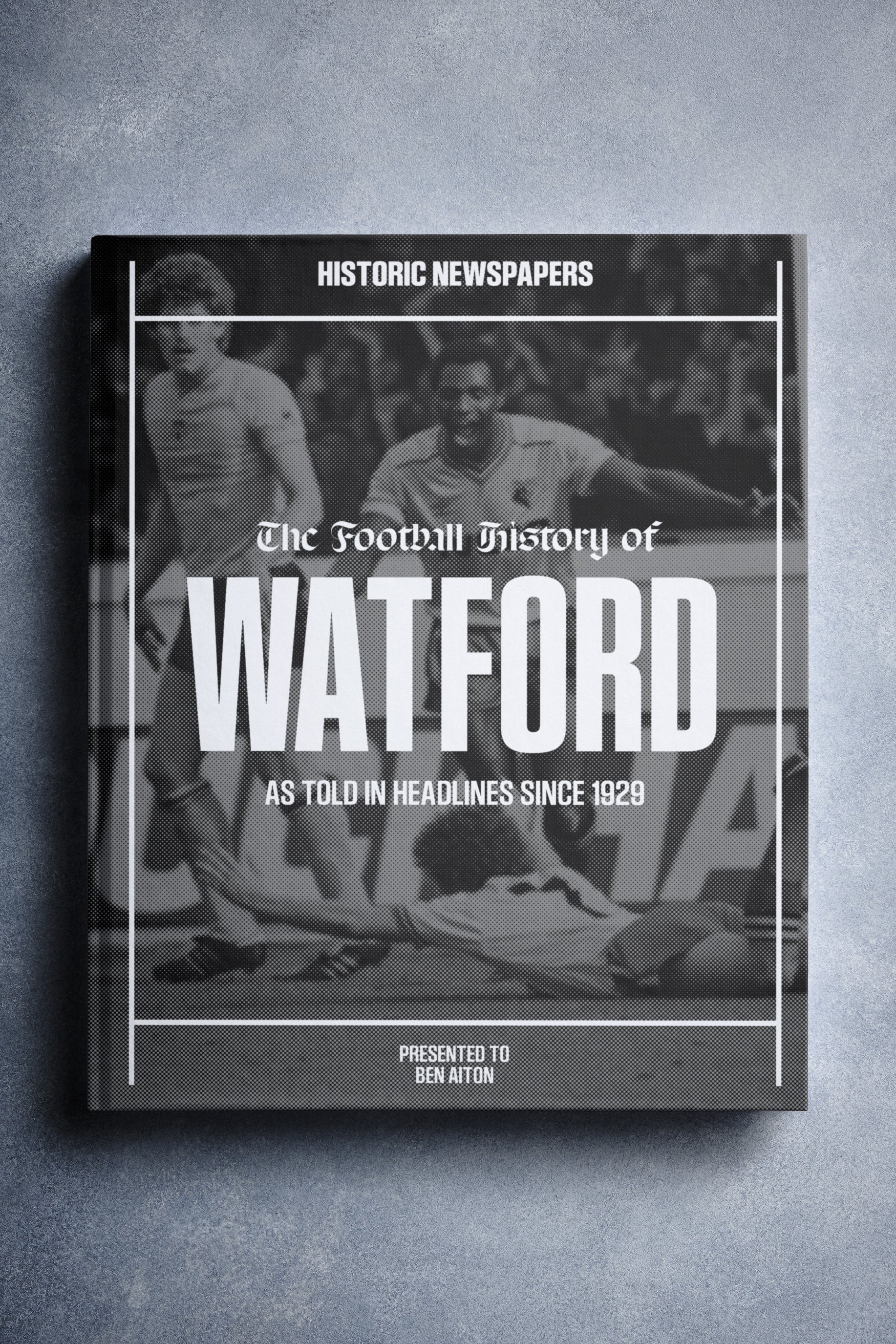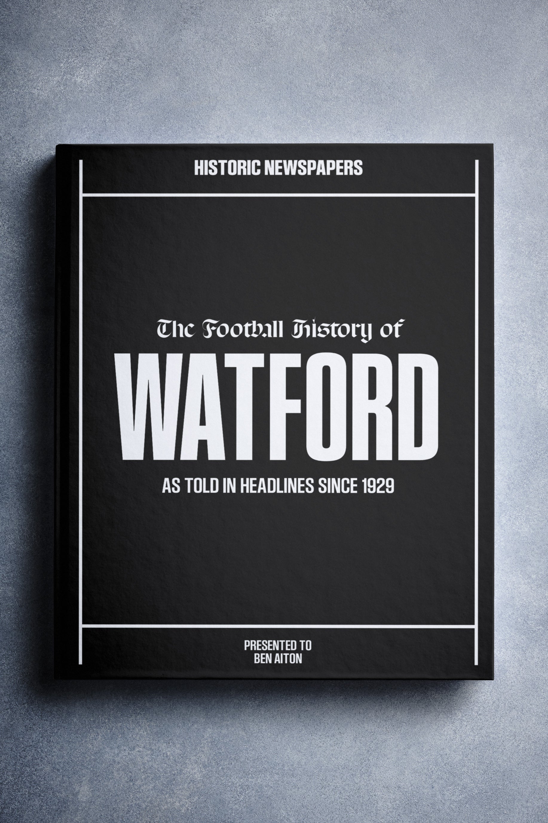 This personalised book features 140 pages of authentic newspaper football reports about Watford, from 1929 onwards. It comes with a choice of covers and the option to have the recipient’s name printed on the cover for free.