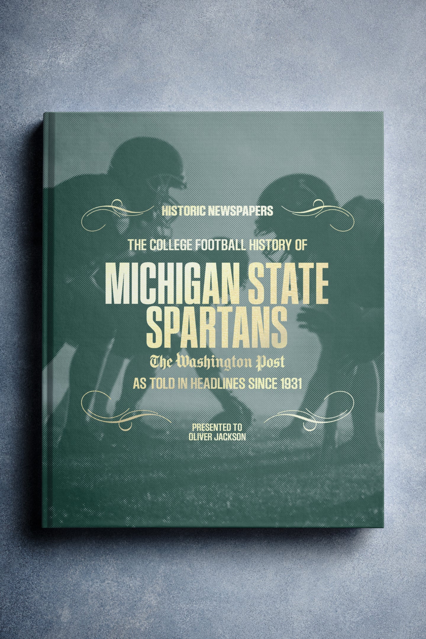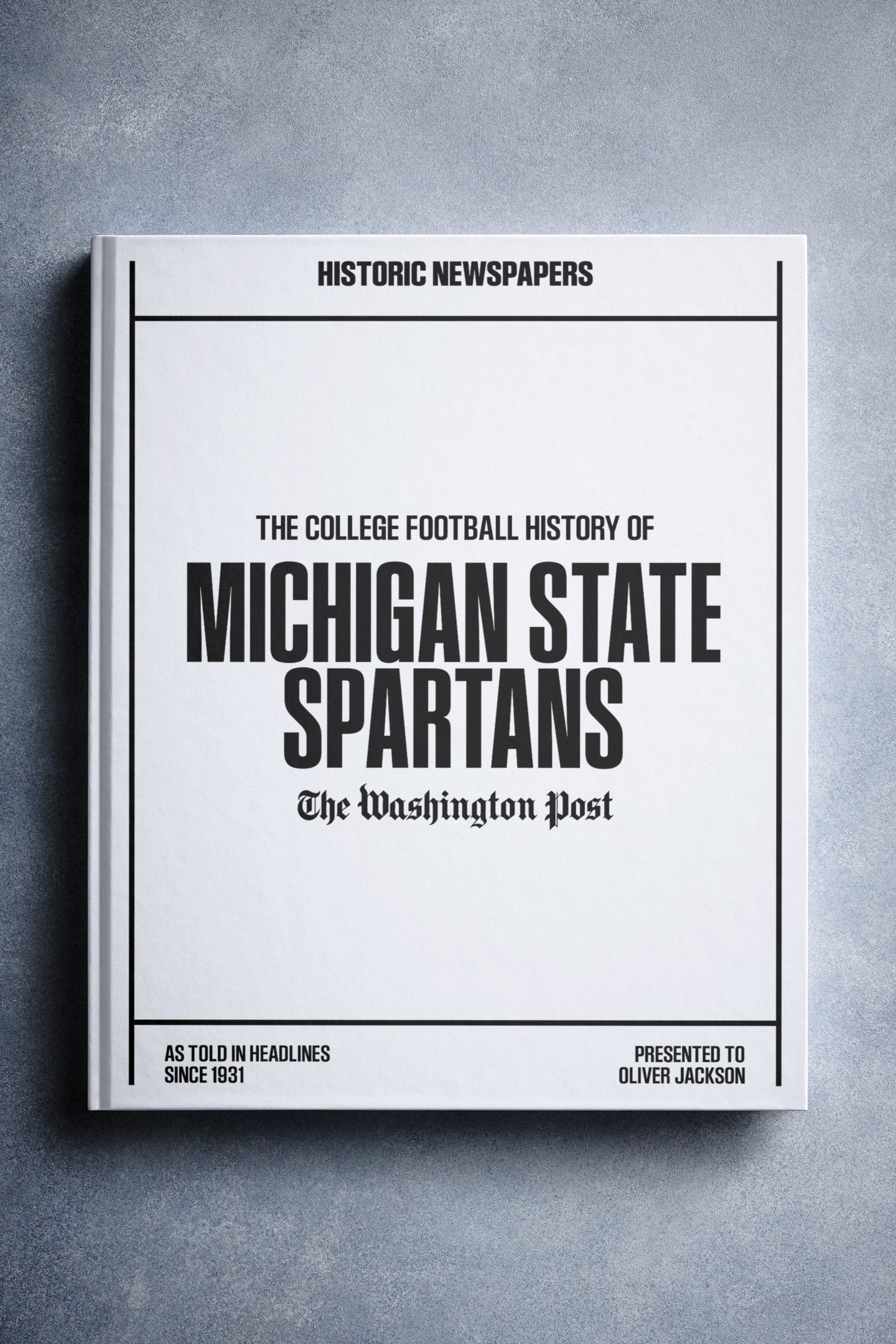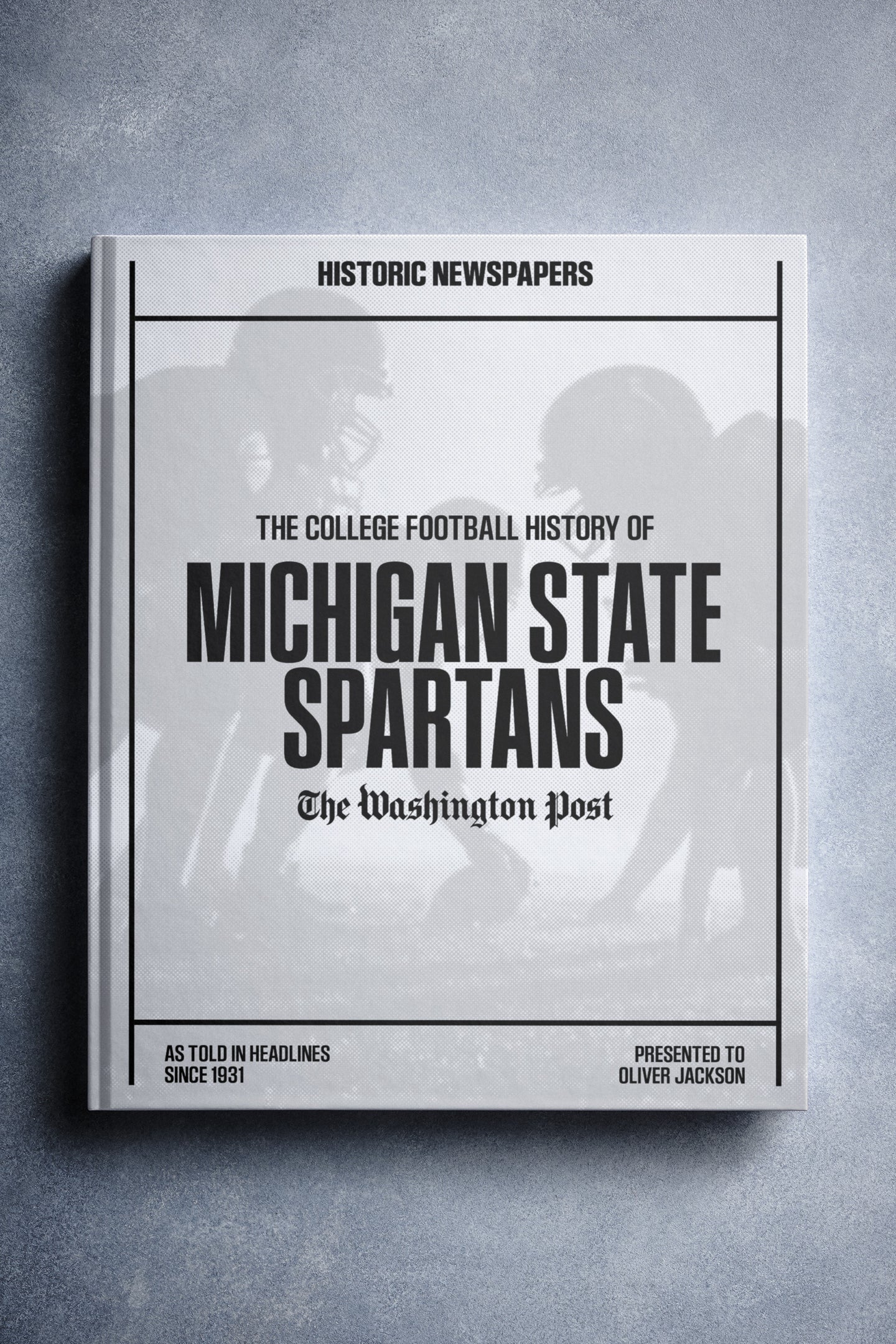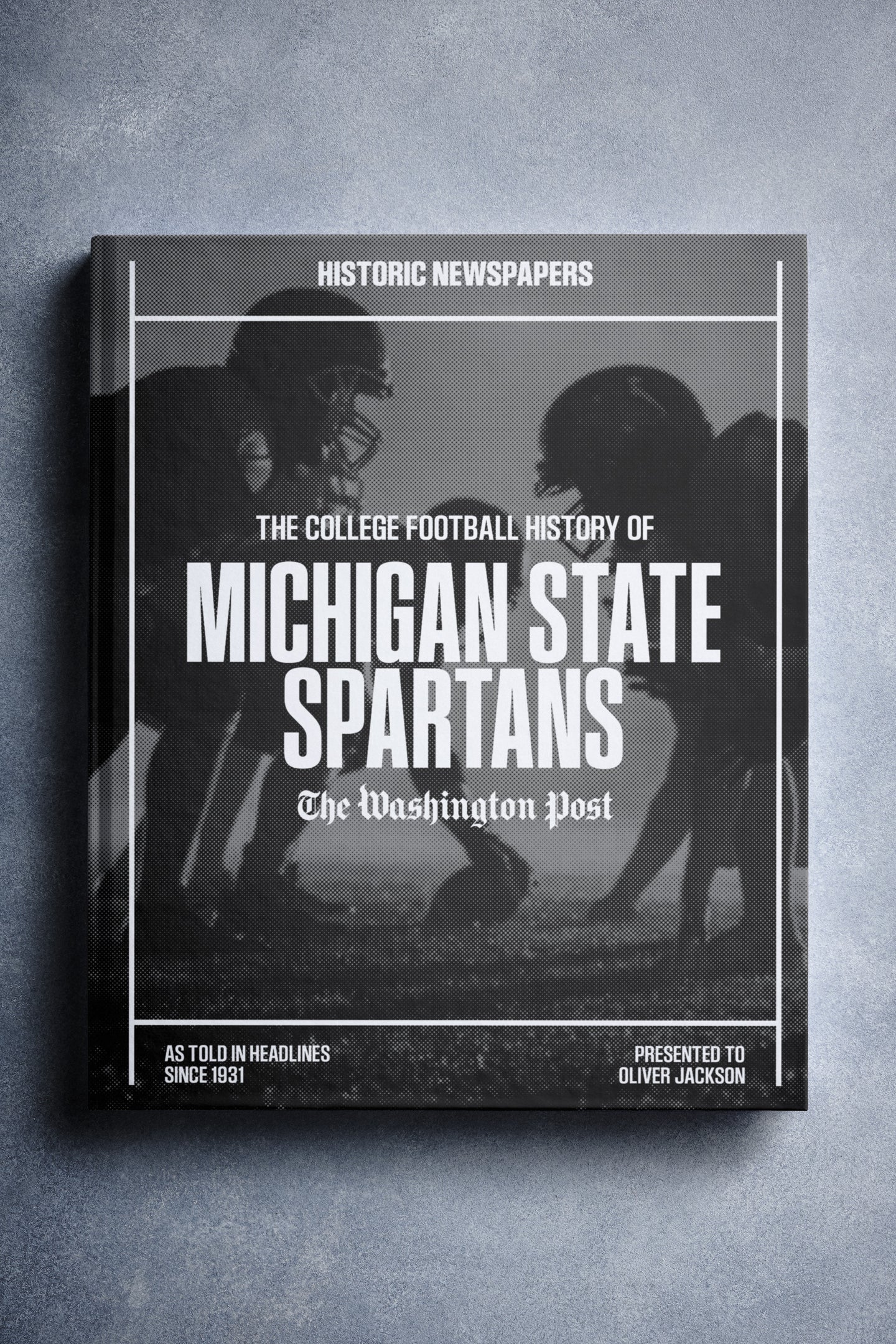 This coffee-table book features over 130 pages of authentic Washington Post newspaper reports about The History of Michigan State Spartans College Football. It comes with a choice of covers and the option to have the recipient’s name printed on the cover for free.