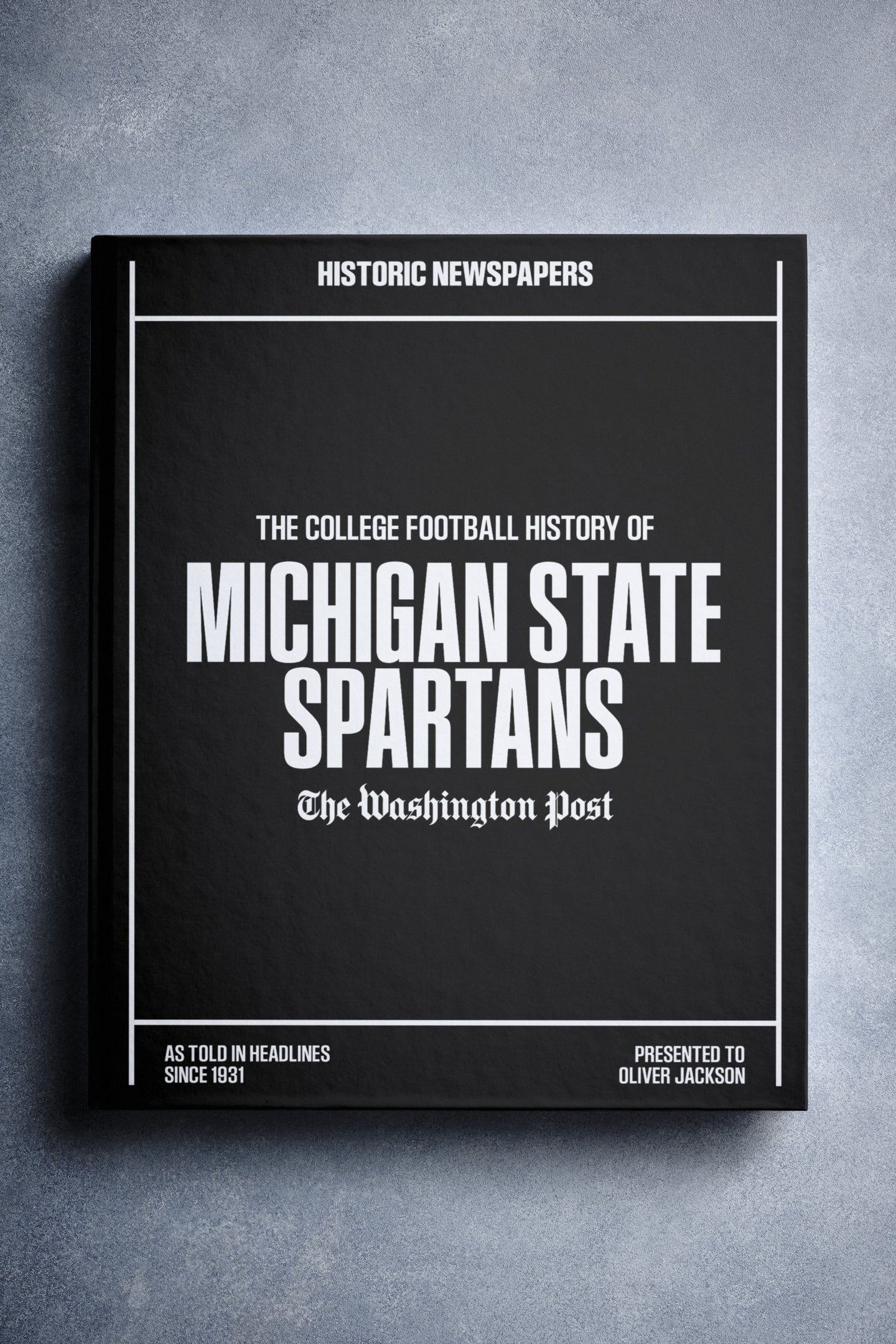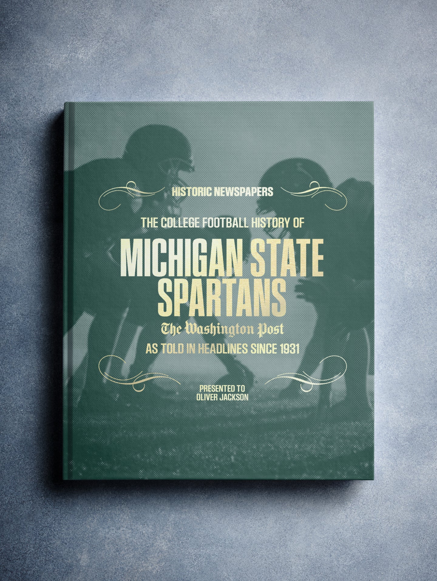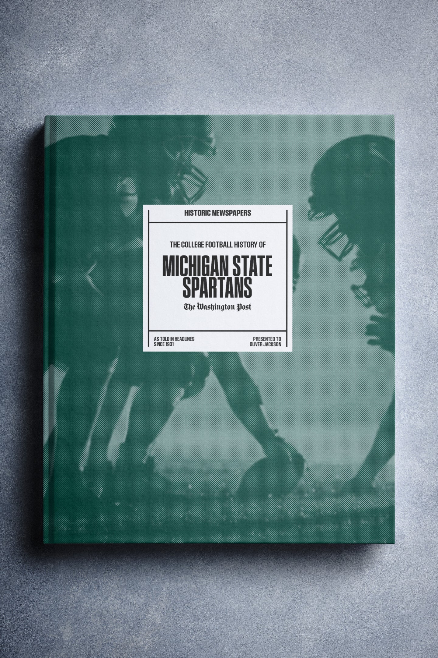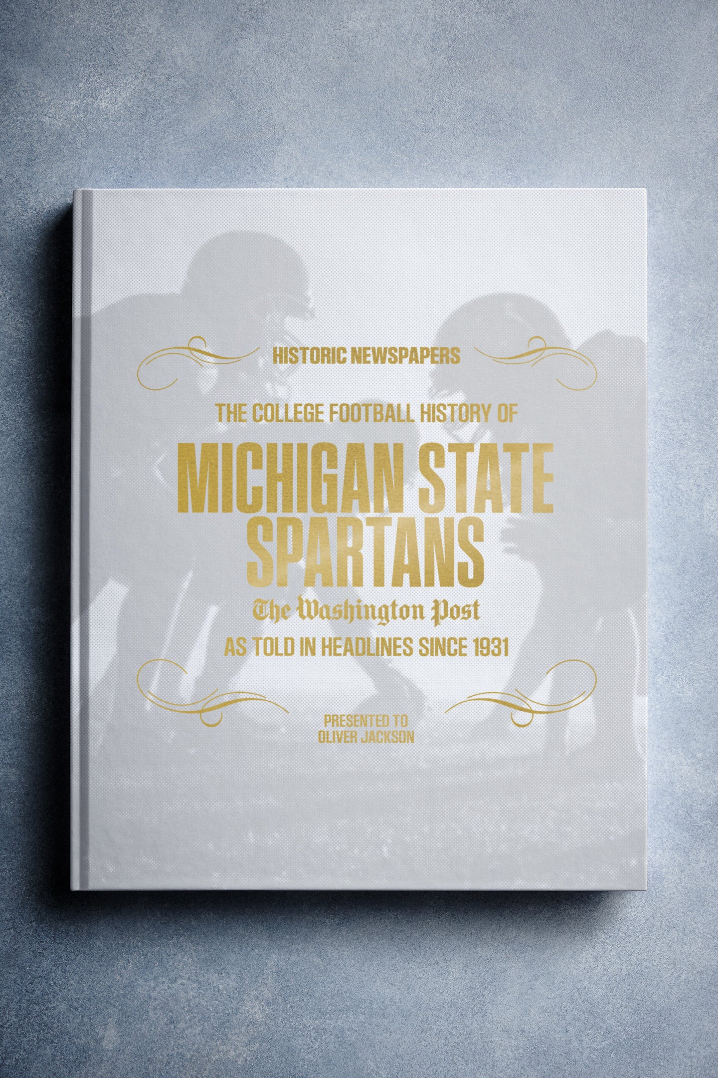 This coffee-table book features over 130 pages of authentic Washington Post newspaper reports about The History of Michigan State Spartans College Football. It comes with a choice of covers and the option to have the recipient’s name printed on the cover for free.