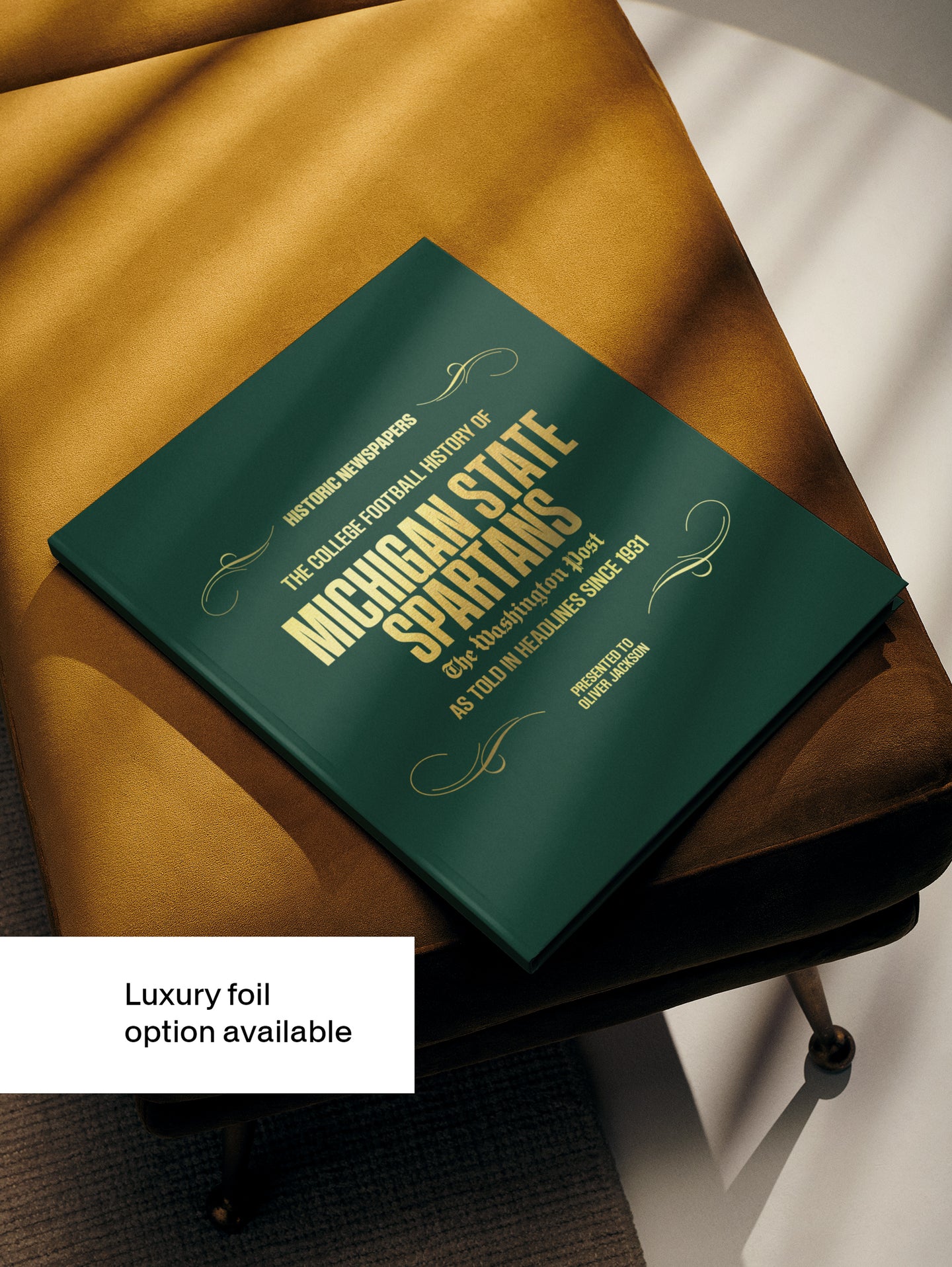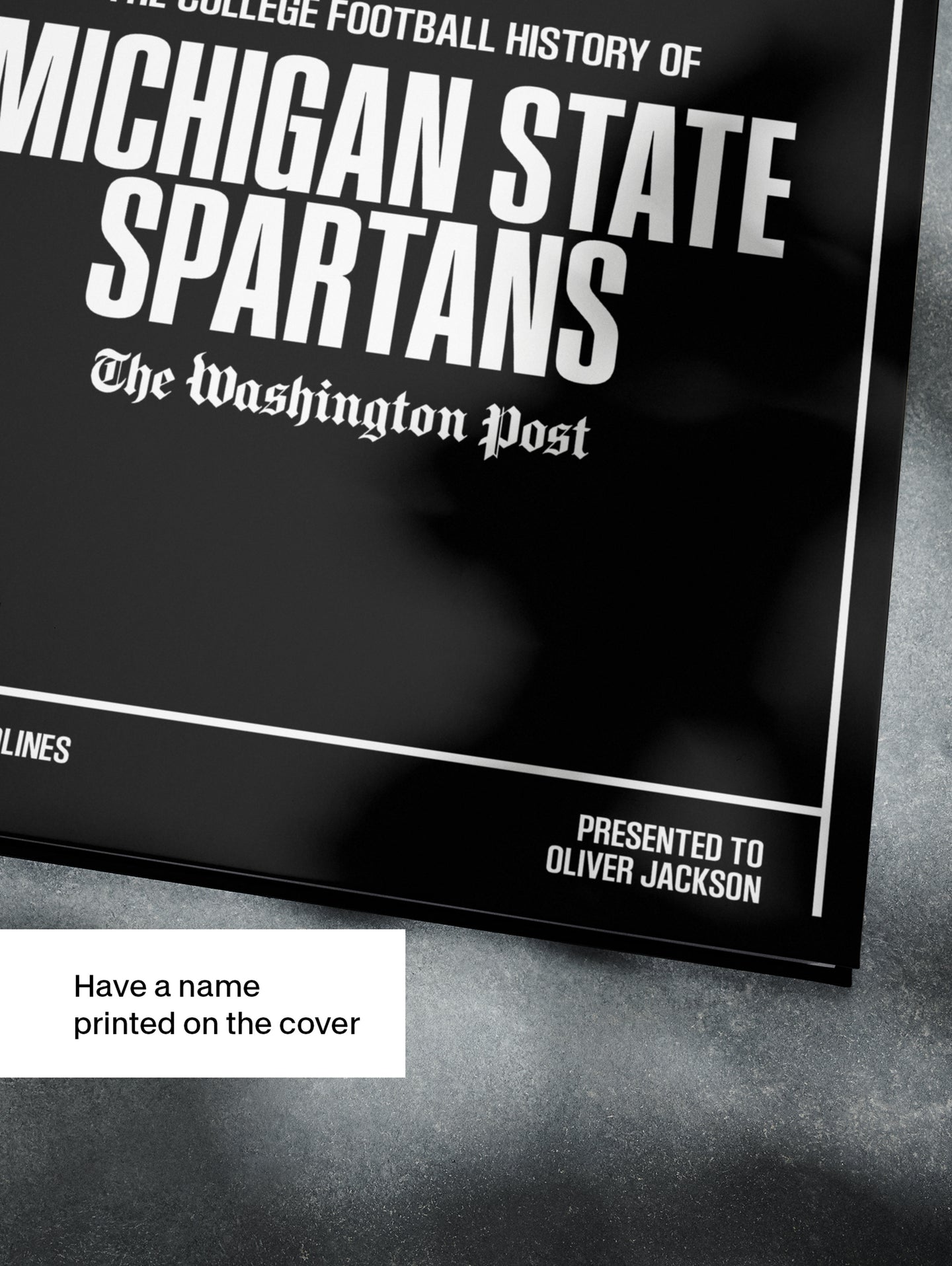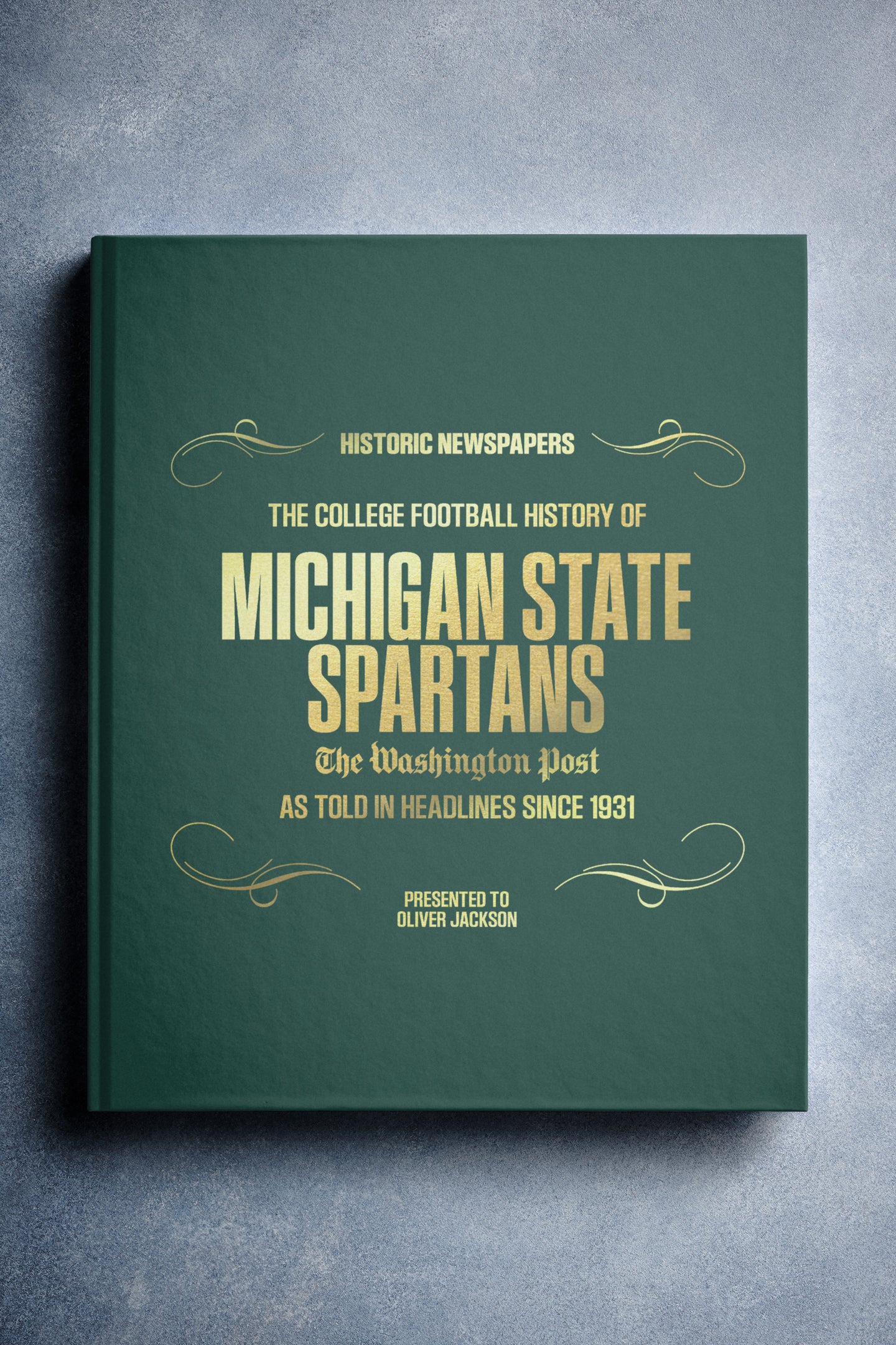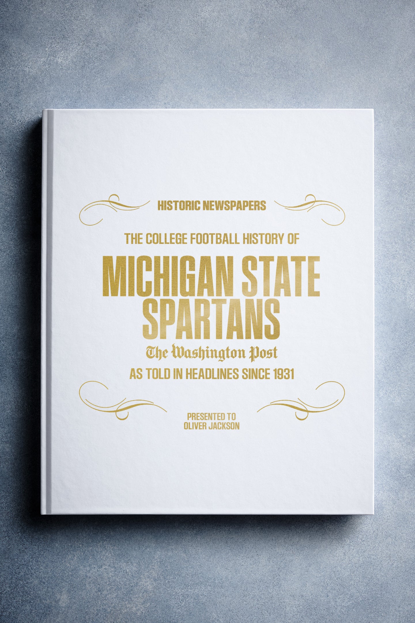 This coffee-table book features over 130 pages of authentic Washington Post newspaper reports about The History of Michigan State Spartans College Football. It comes with a choice of covers and the option to have the recipient’s name printed on the cover for free.