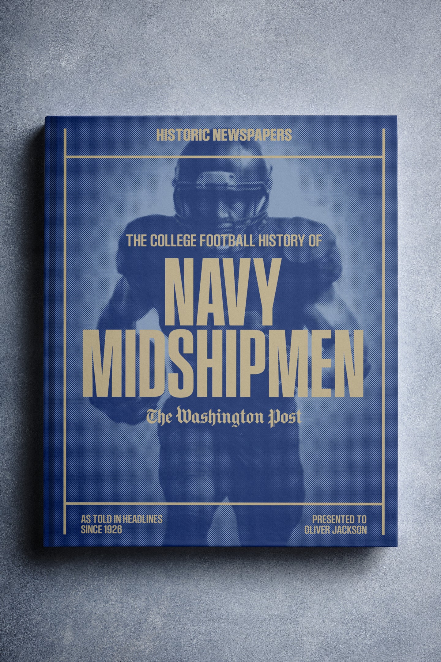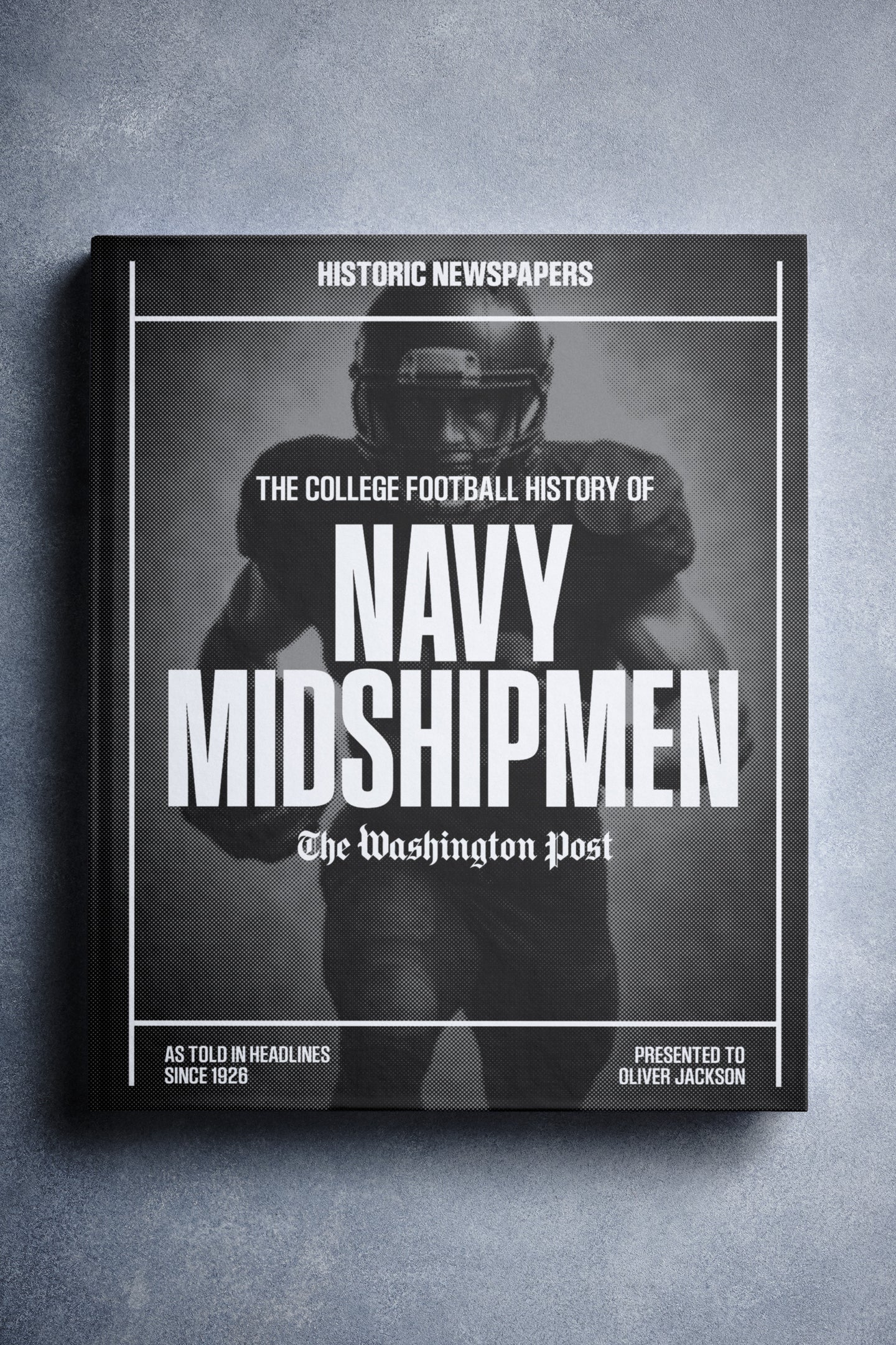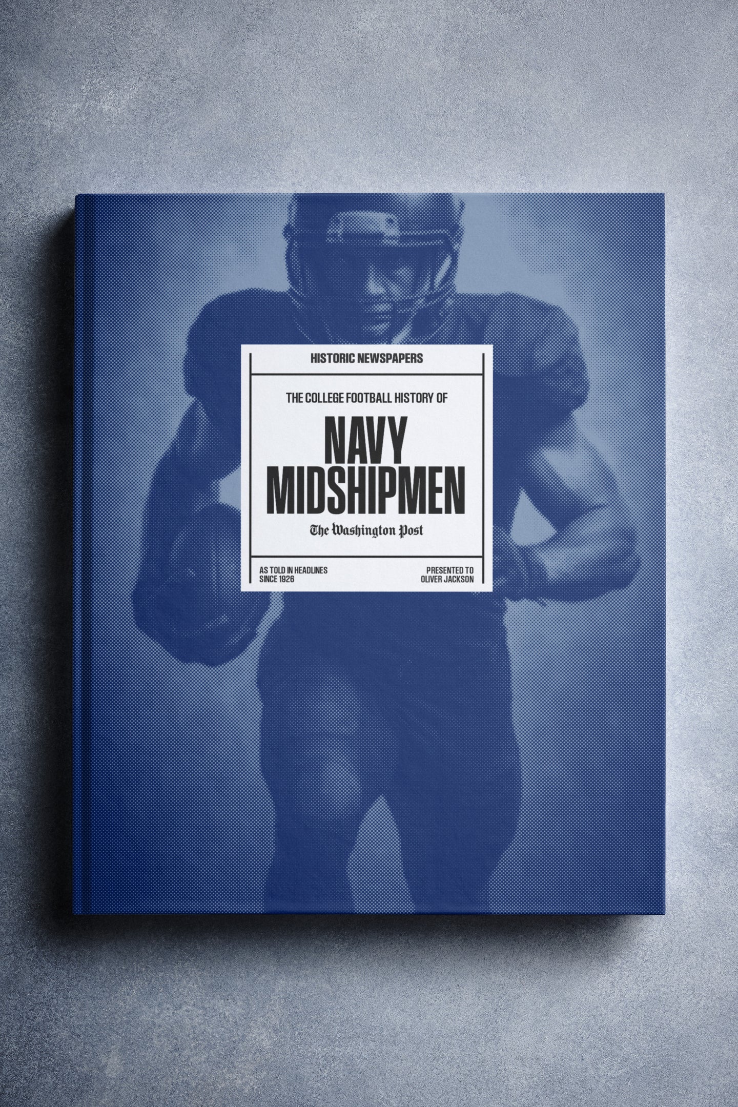 This coffee-table book features over 150 pages of authentic Washington Post newspaper reports about The History of Navy Midshipmen College Football. It comes with a choice of covers and the option to have the recipient’s name printed on the cover for free.