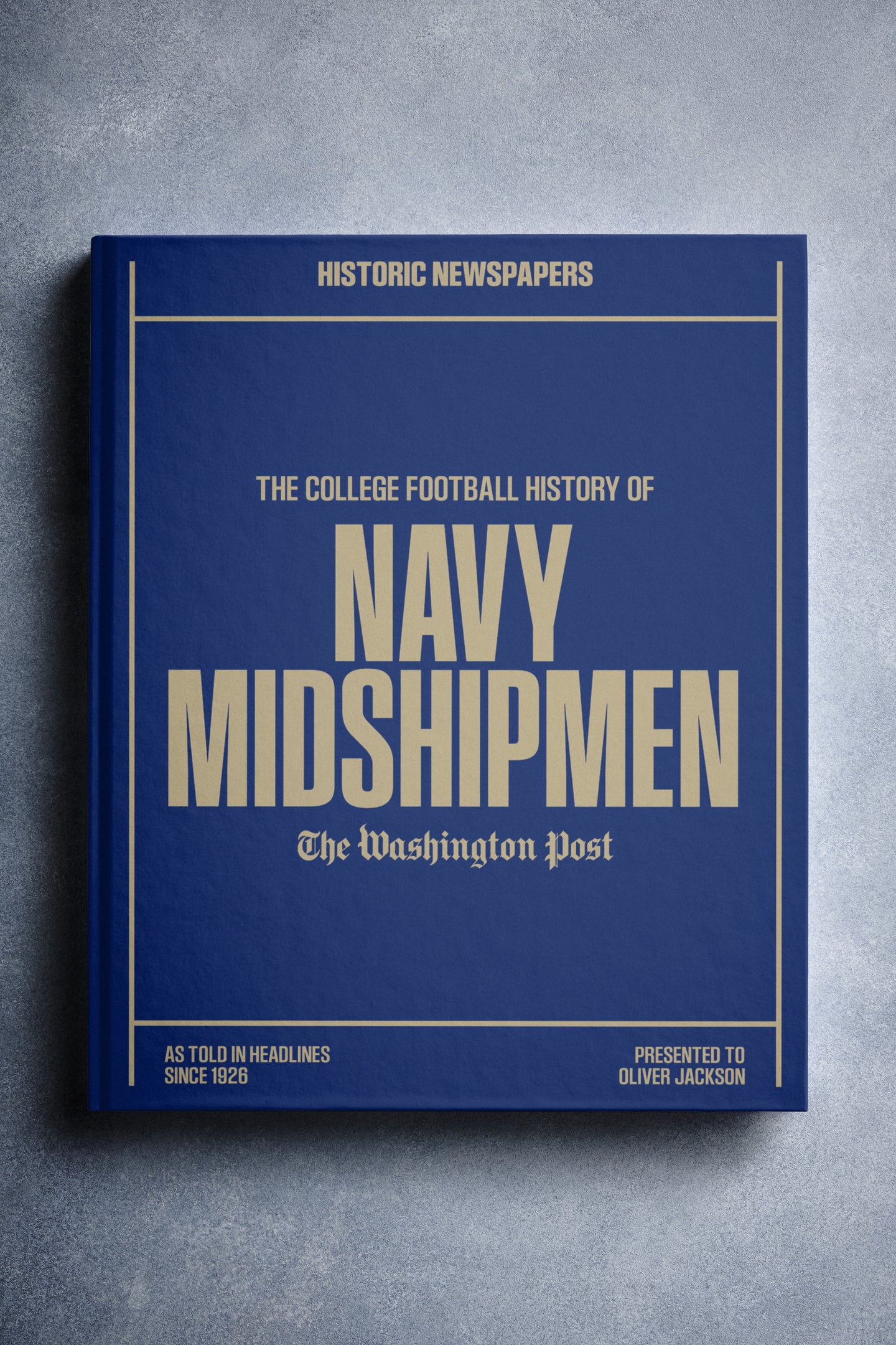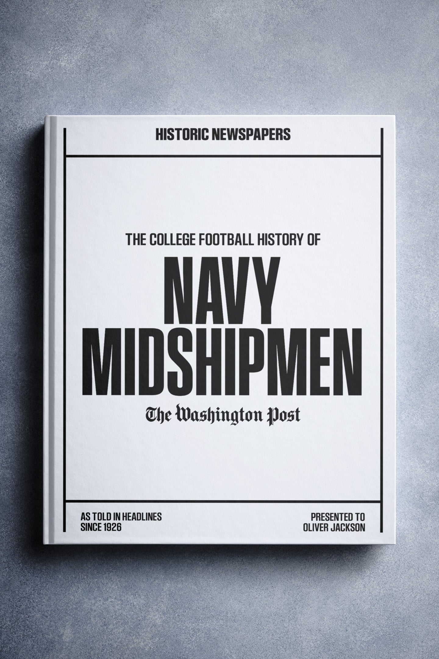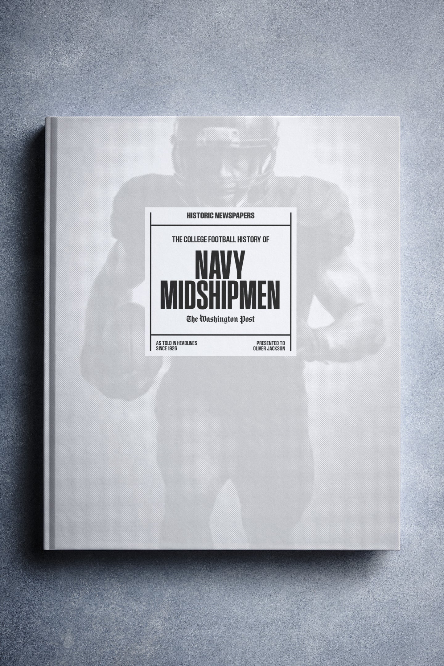 This coffee-table book features over 150 pages of authentic Washington Post newspaper reports about The History of Navy Midshipmen College Football. It comes with a choice of covers and the option to have the recipient’s name printed on the cover for free.