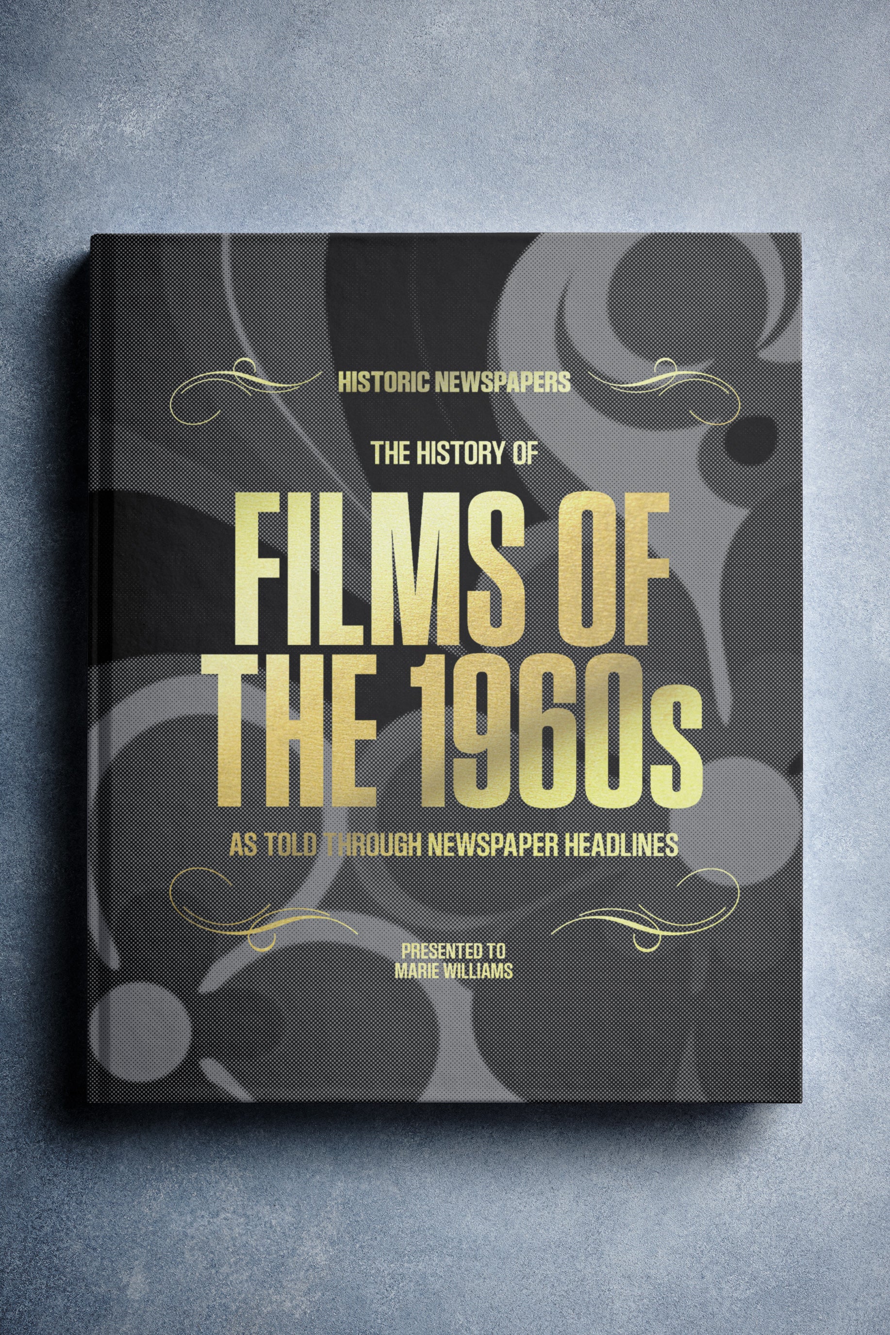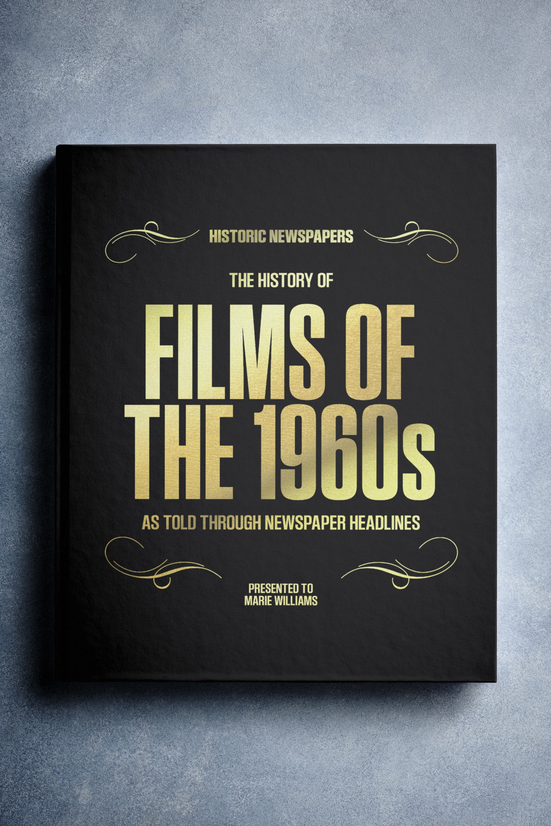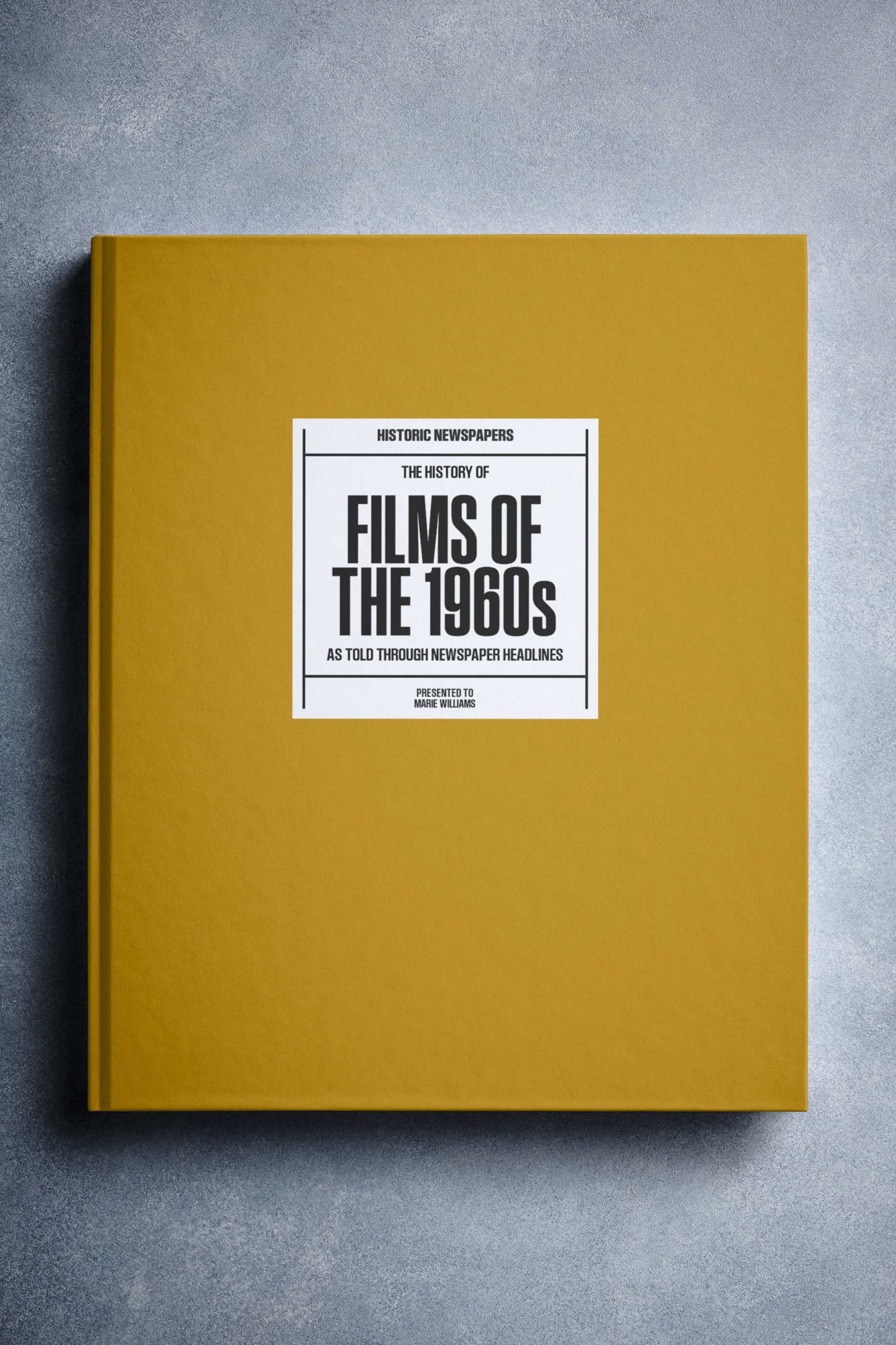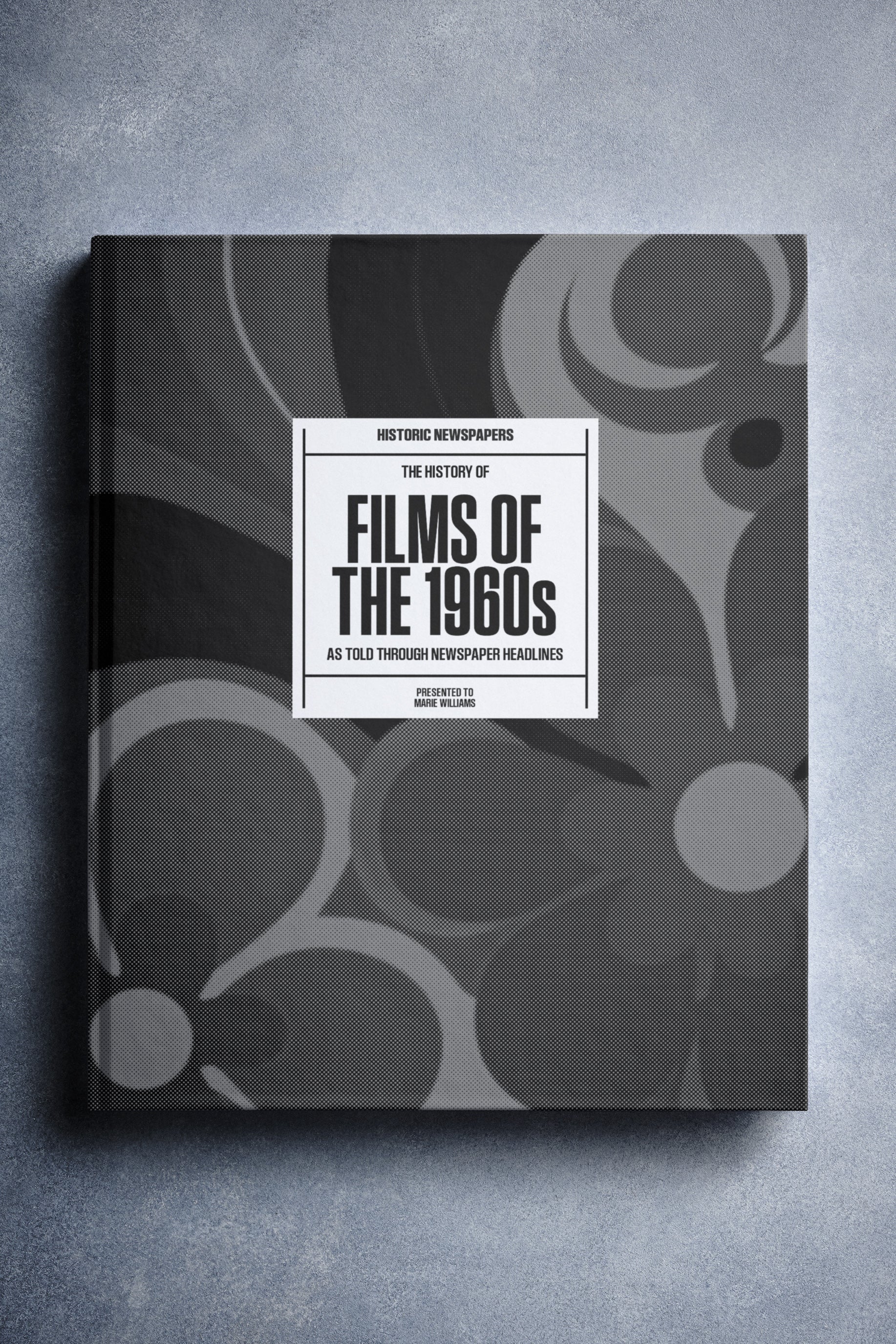 This coffee-table book features over 140 pages of original newspaper reports about The History of 1960s Movies. It comes with a choice of covers and the option to have the recipient’s name printed on the cover for free.