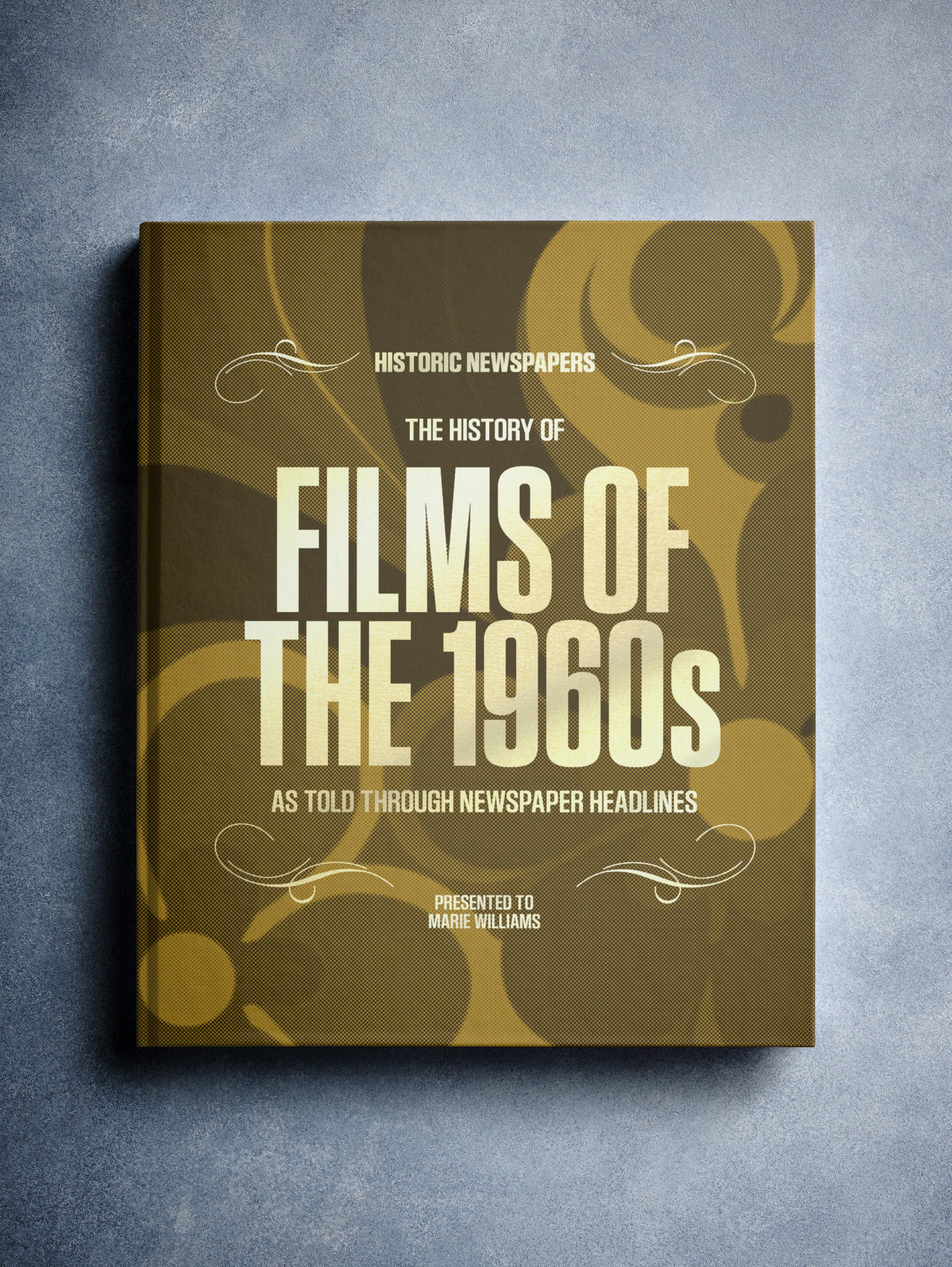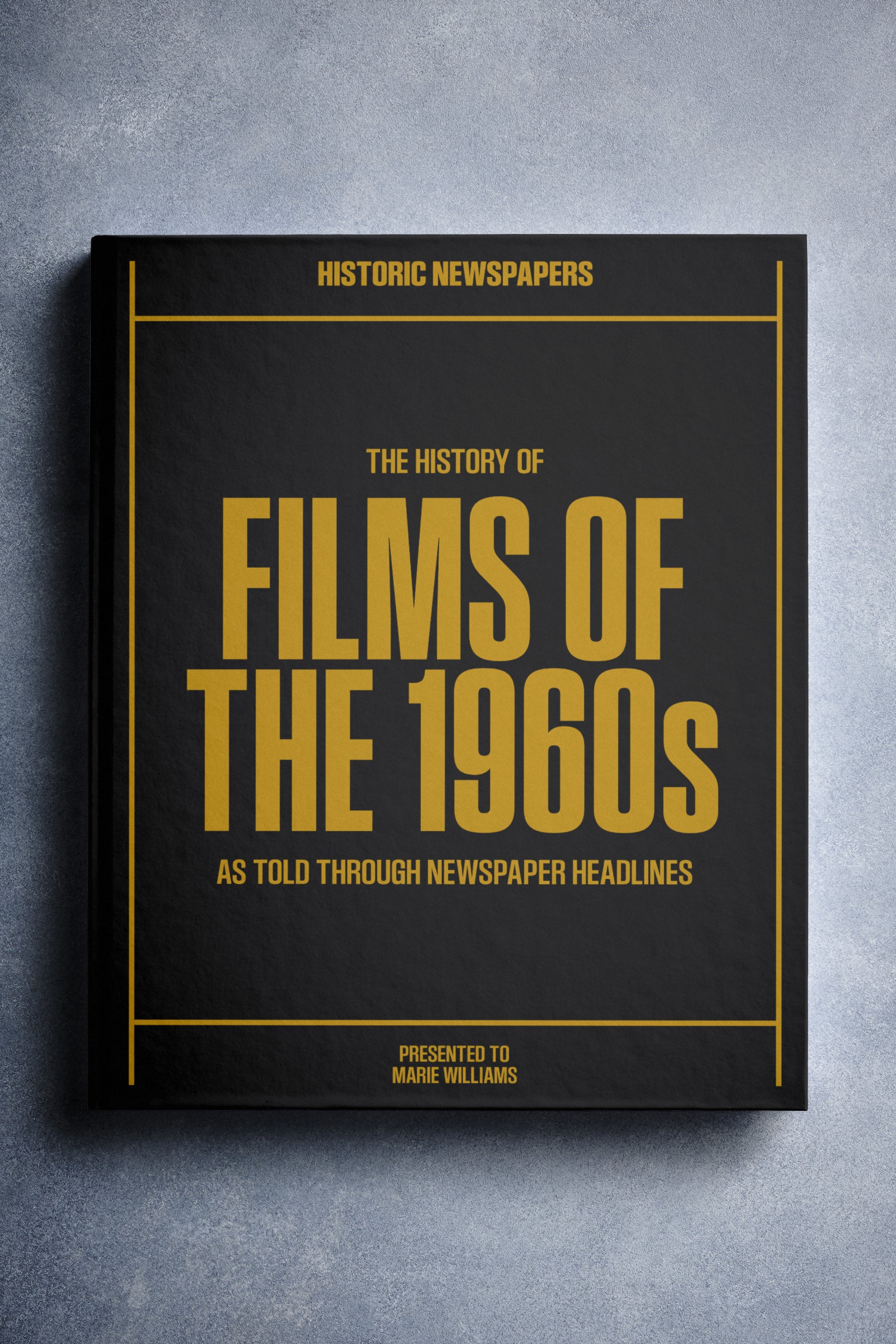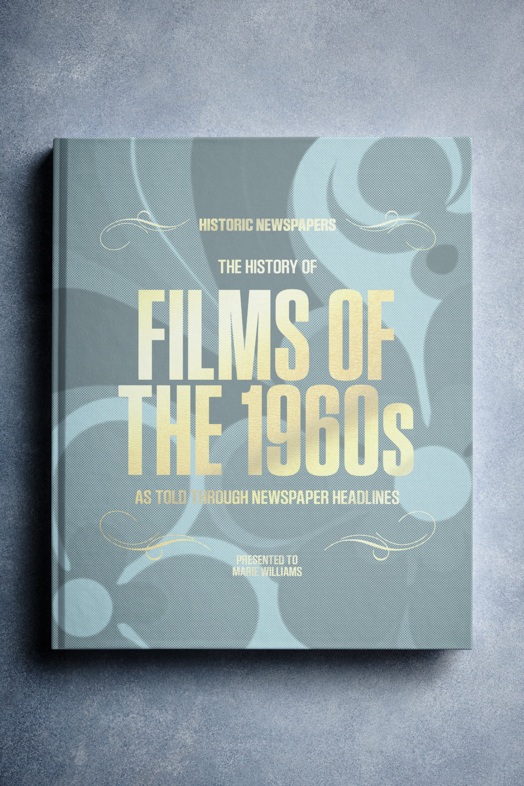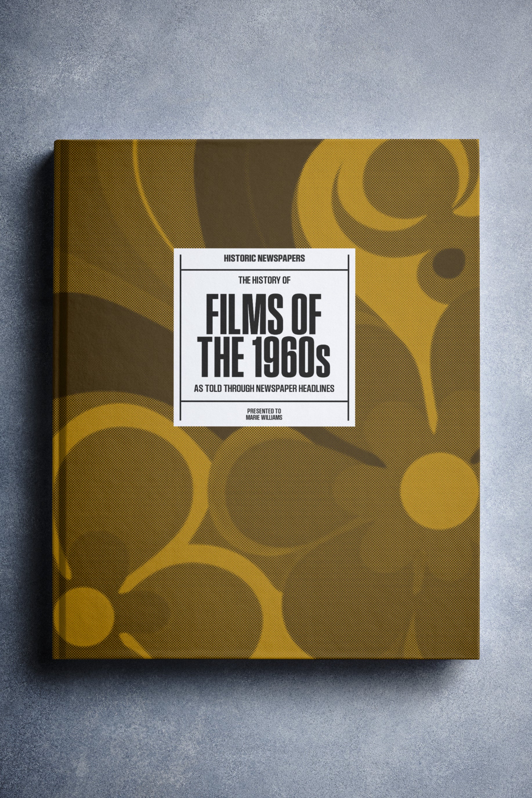 This coffee-table book features over 140 pages of original newspaper reports about The History of 1960s Movies. It comes with a choice of covers and the option to have the recipient’s name printed on the cover for free.