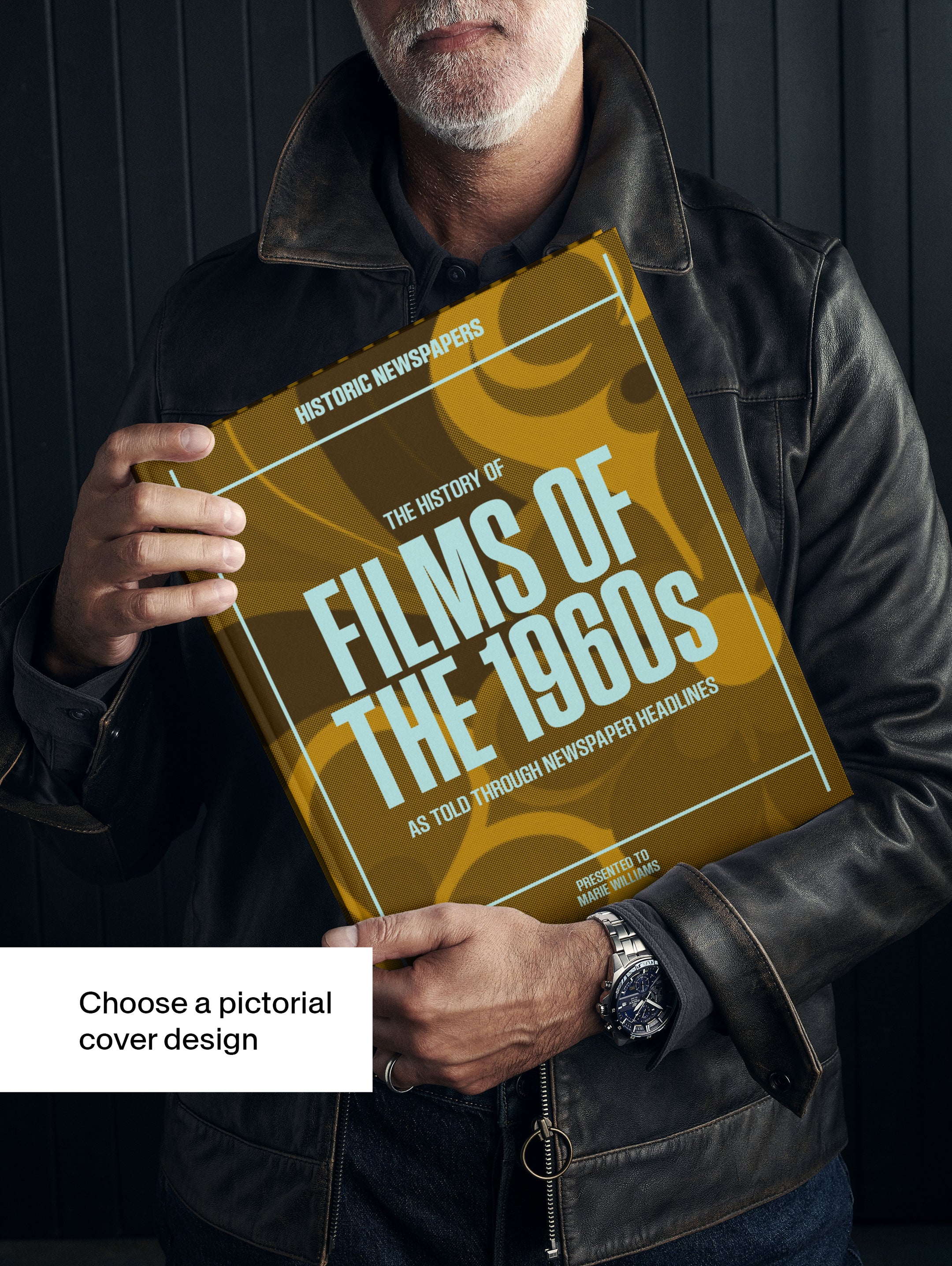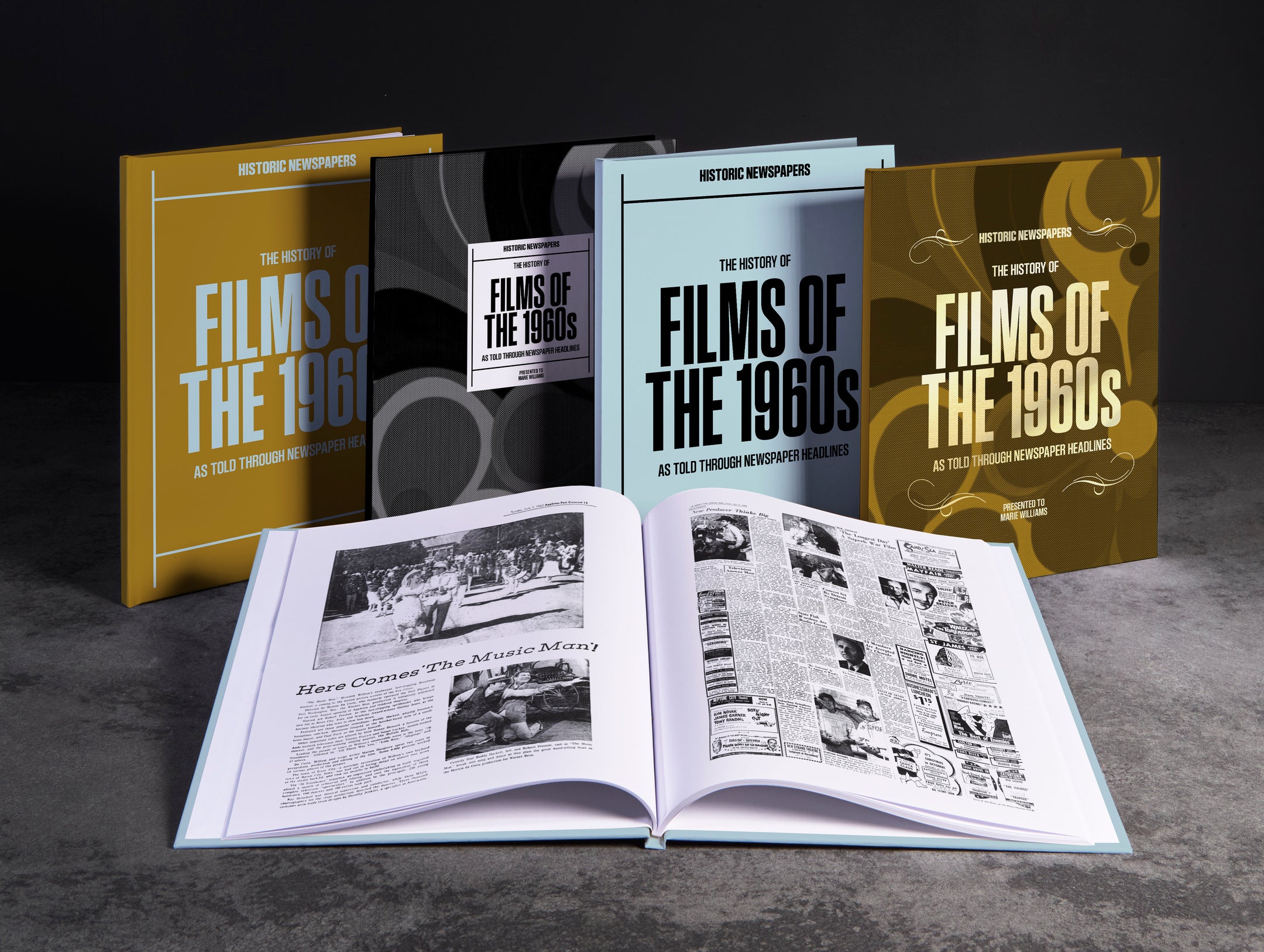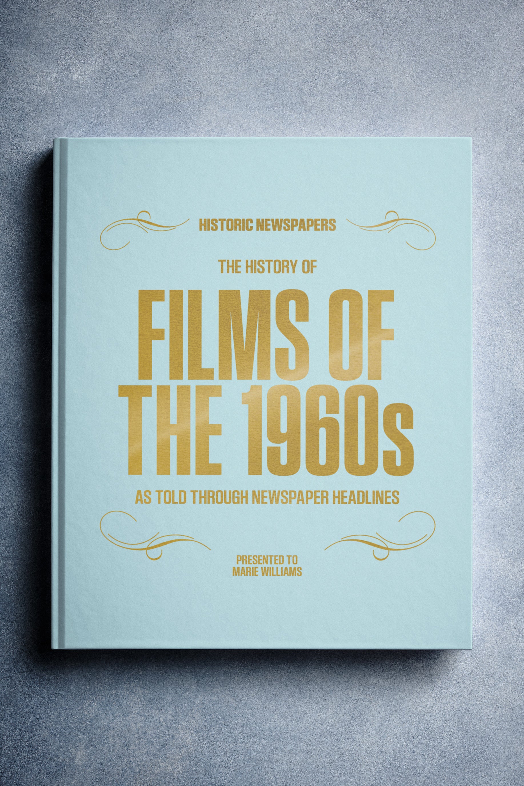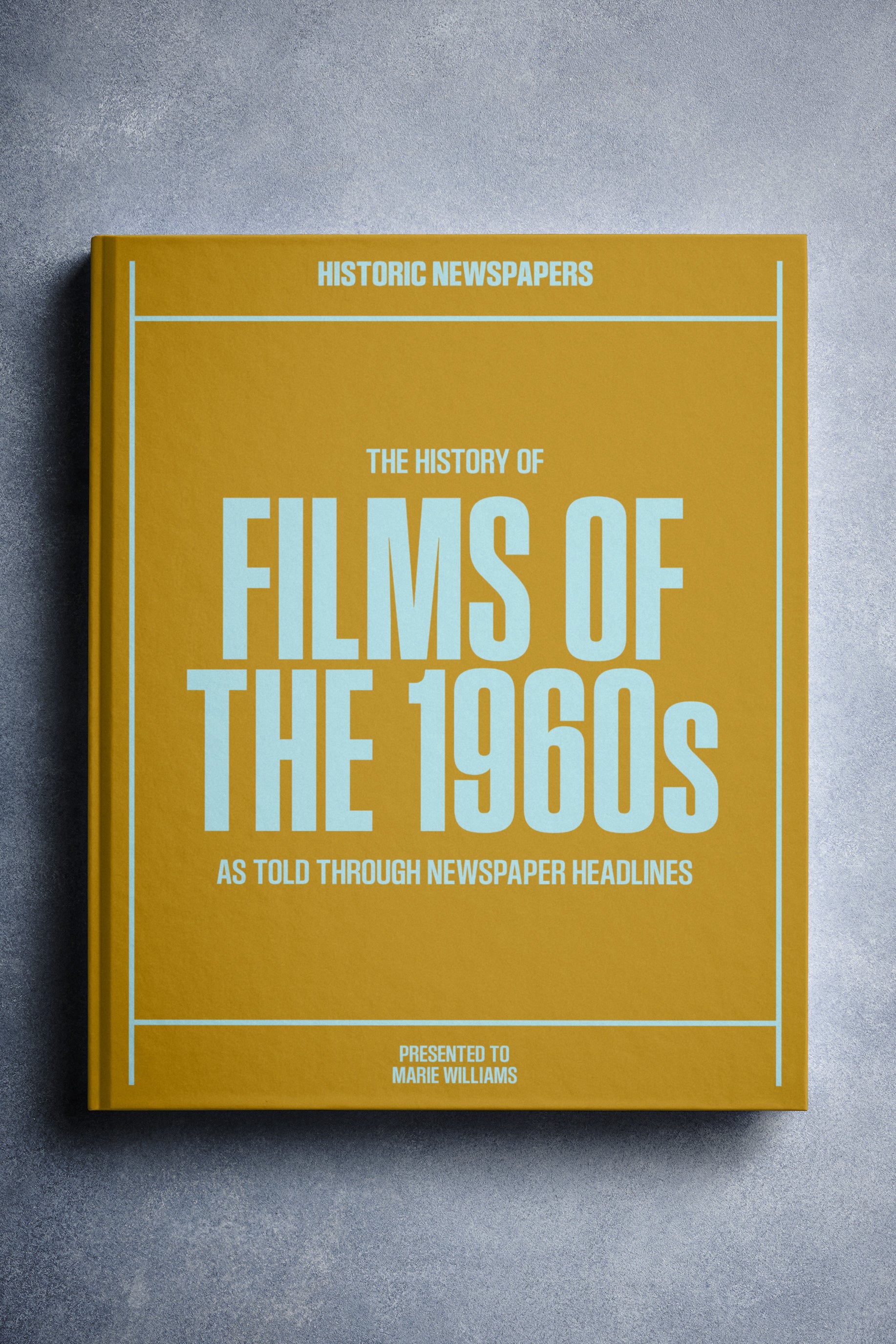 This coffee-table book features over 140 pages of original newspaper reports about The History of 1960s Movies. It comes with a choice of covers and the option to have the recipient’s name printed on the cover for free.